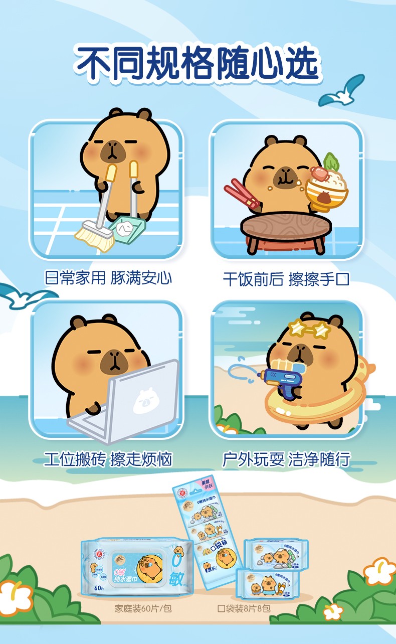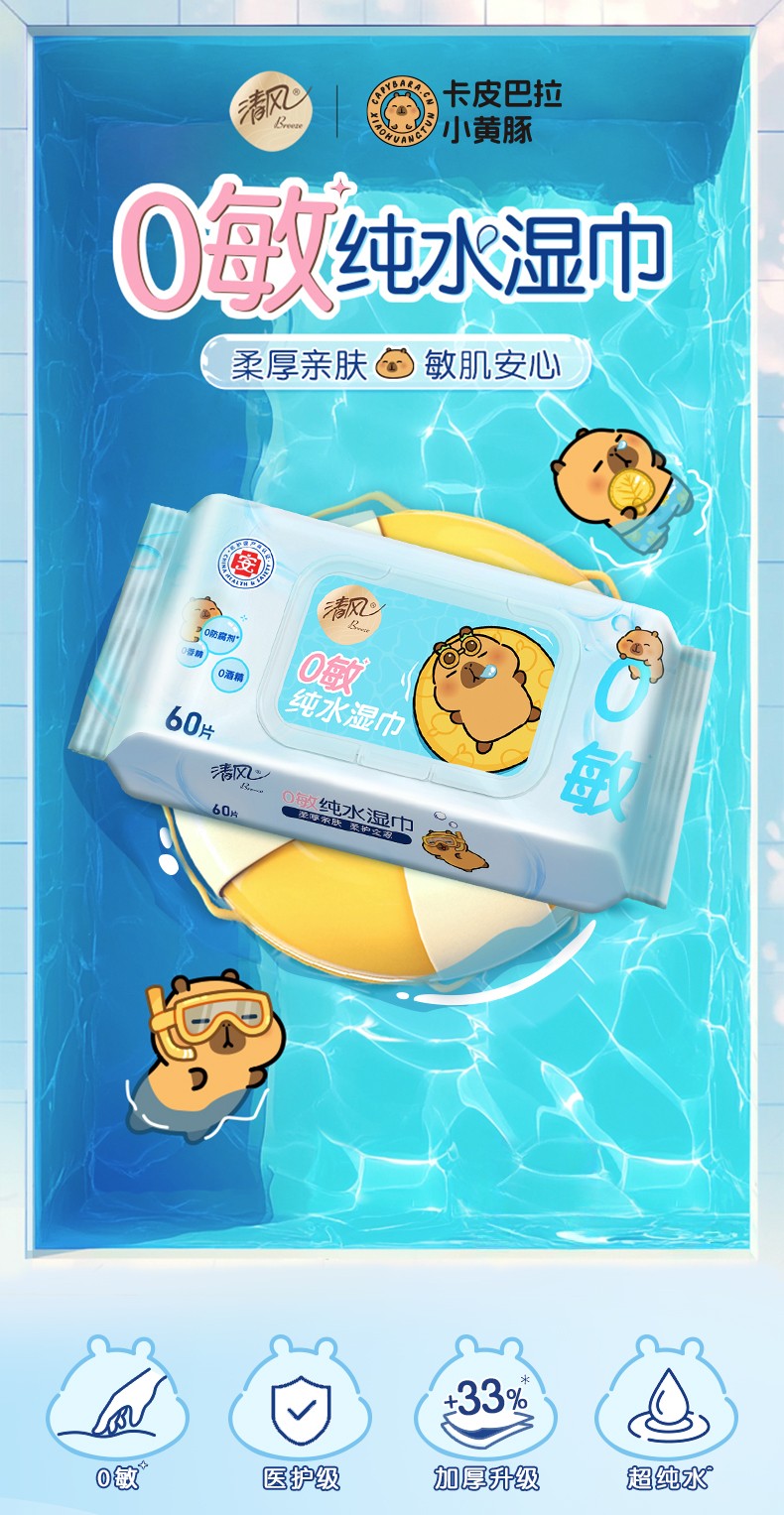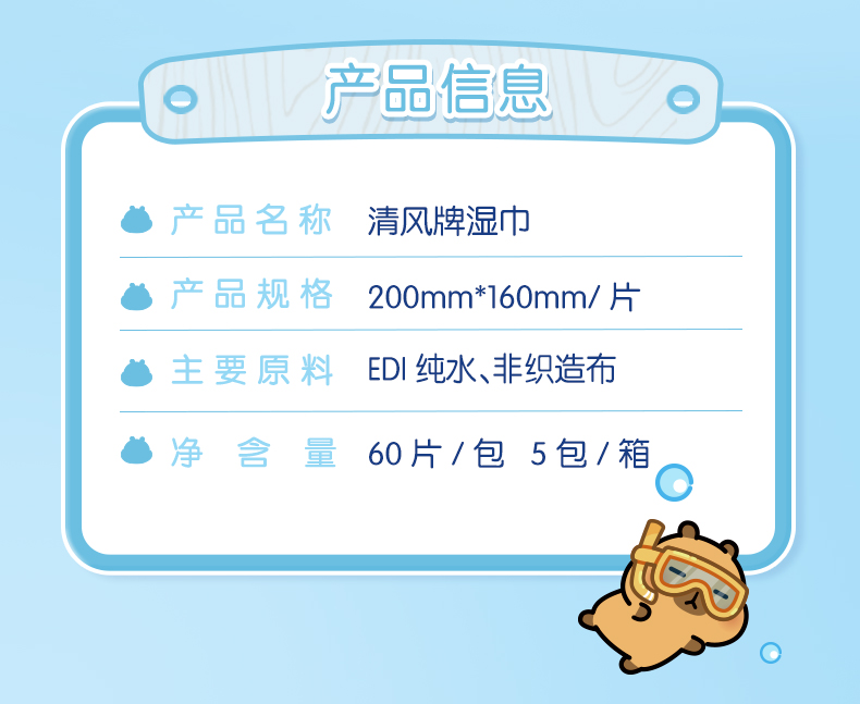 商品名称:清风卡皮巴拉IP纯水1层60片/包*1*5湿纸巾BWB60CE2/51011483