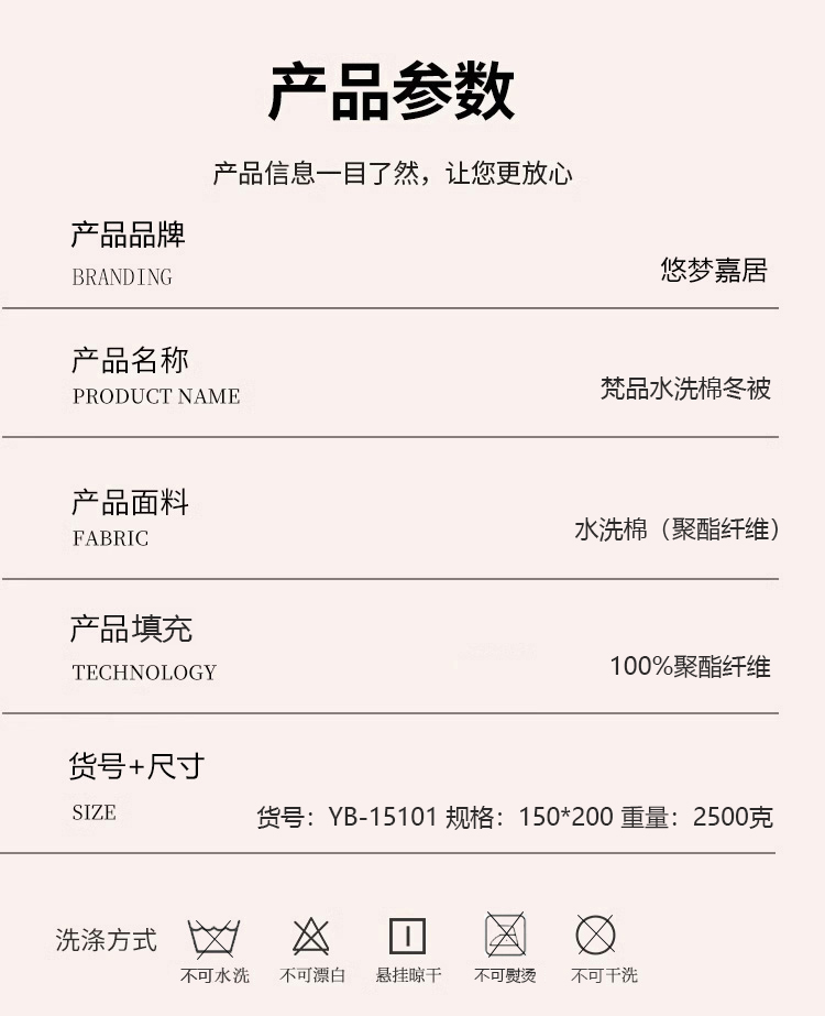 商品名称:悠梦嘉居YB-15101梵品水洗棉冬被 150*200CM2500克(内蒙、新疆、西藏、青海、宁夏、甘肃运费另算)