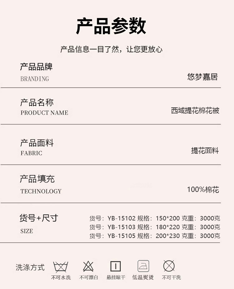 商品名称:悠梦嘉居YB-15103西域提花棉花被180*220CM3000克(内蒙、新疆、西藏、青海、宁夏、甘肃运费另算)