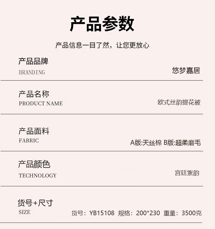 商品名称:悠梦嘉居YB15108欧式丝韵提花被 200*230CM3500克(内蒙、新疆、西藏、青海、宁夏、甘肃运费另算)