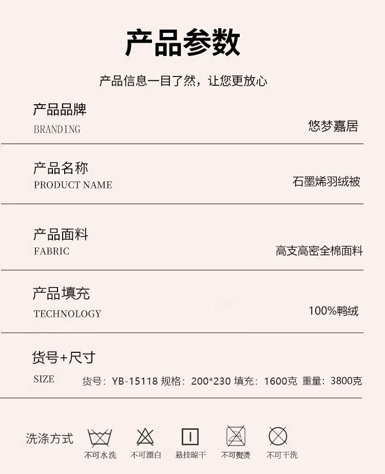 商品名称:悠梦嘉居YB-15118石墨烯羽绒被200*230CM3800克(内蒙、新疆、西藏、青海、宁夏、甘肃运费另算)