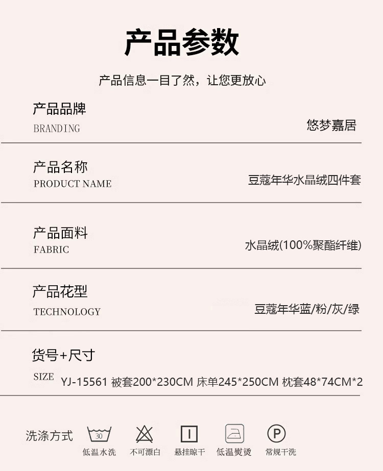 商品名称:悠梦嘉居 YJ-15561豆蔻年华水晶绒四件套4500克 200*230CM 豆蔻年华粉 、新疆、西藏、青海、宁夏、甘肃运费另算)