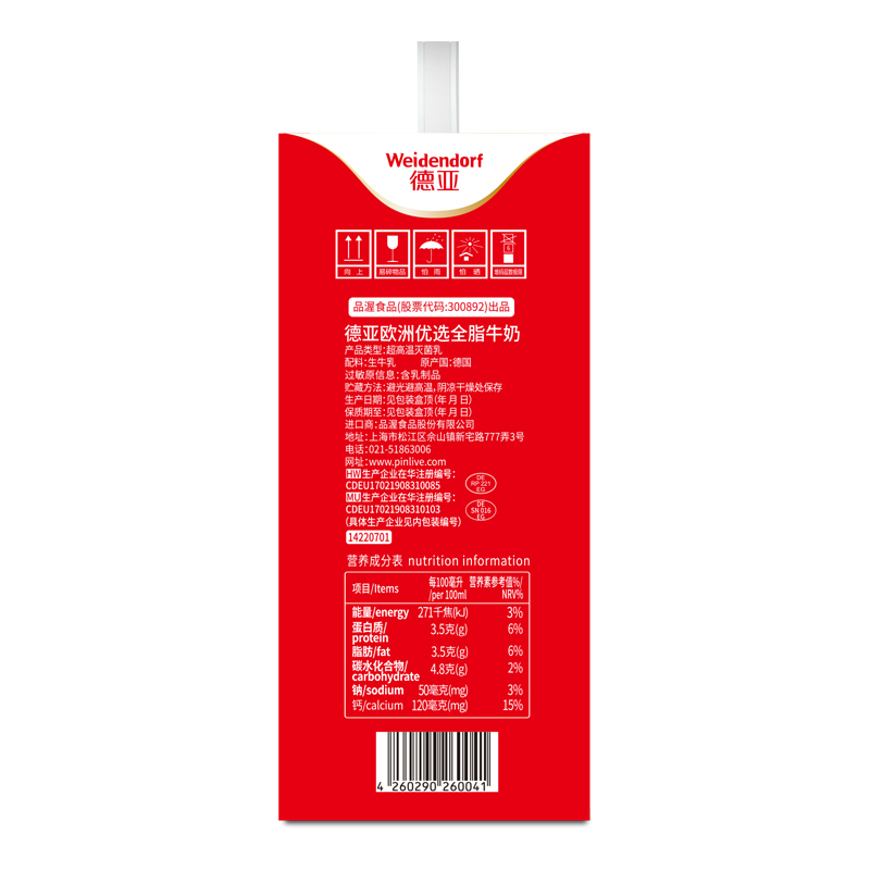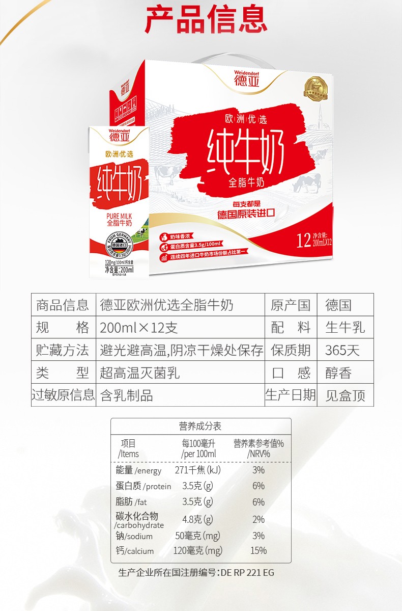 商品名称:德亚欧洲优选全脂纯牛奶200ml*12盒(多版本随机发货)DY3201607