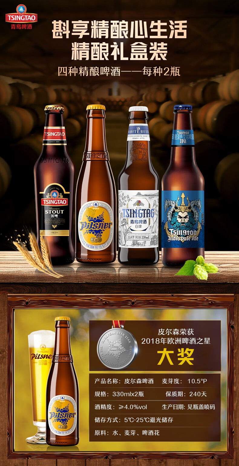 商品名称:青岛啤酒精酿小瓶330*8礼盒箱啤