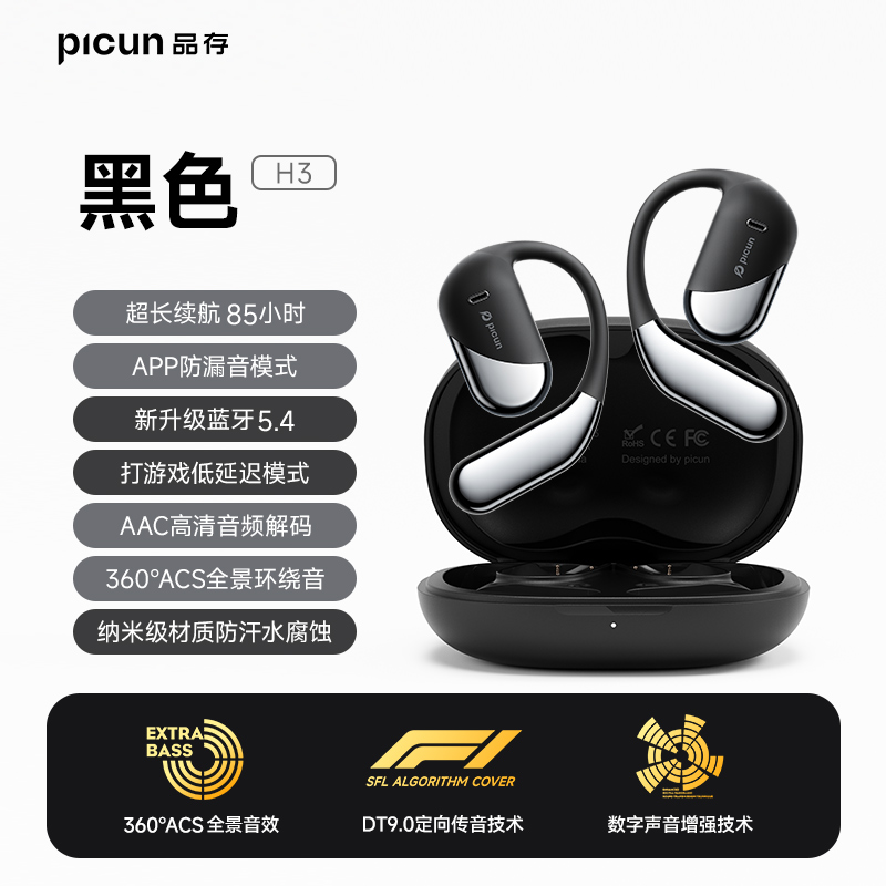 品存(picun)双麦耳挂骨传导纳米级防汗防水无线耳机 H3黑色 6970604903295 偏远加运费