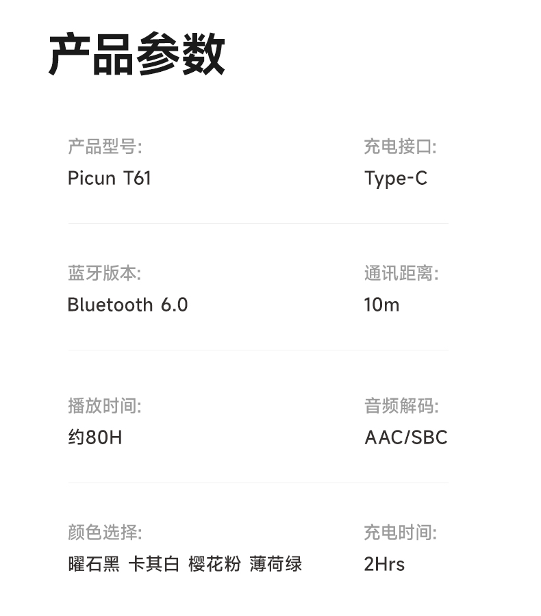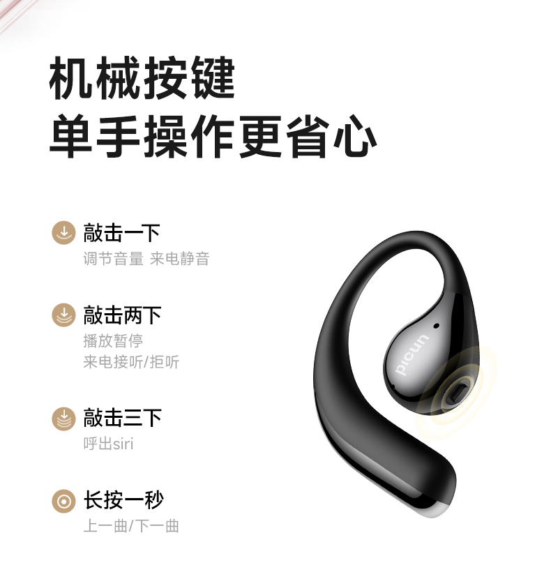 商品名称:品存(picun) 智能降噪耳挂骨传导无孔I耳机 T61樱花粉/绿/白/黑 6970604903974 偏远加运费