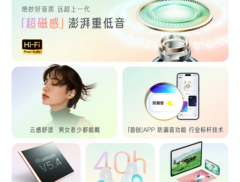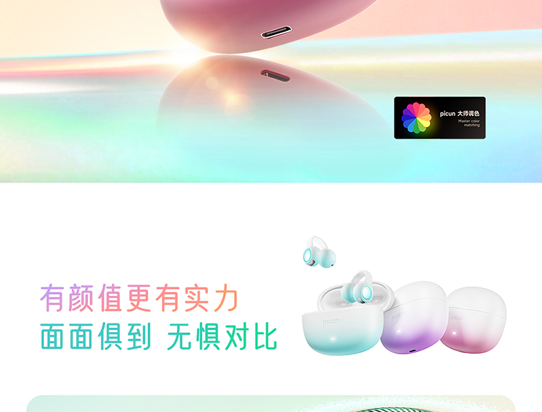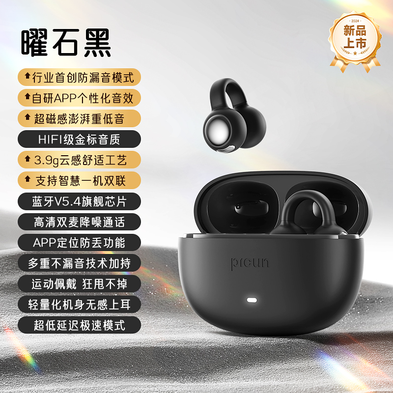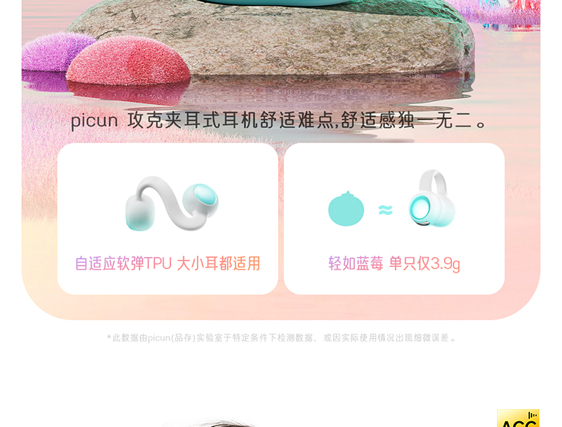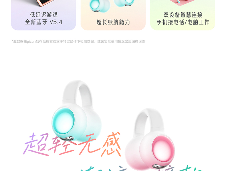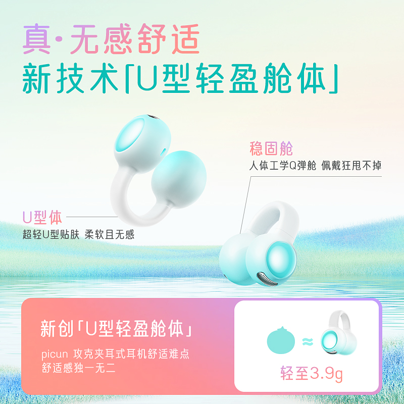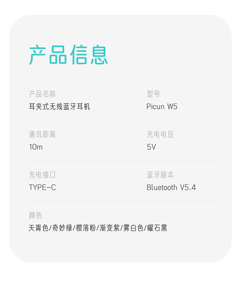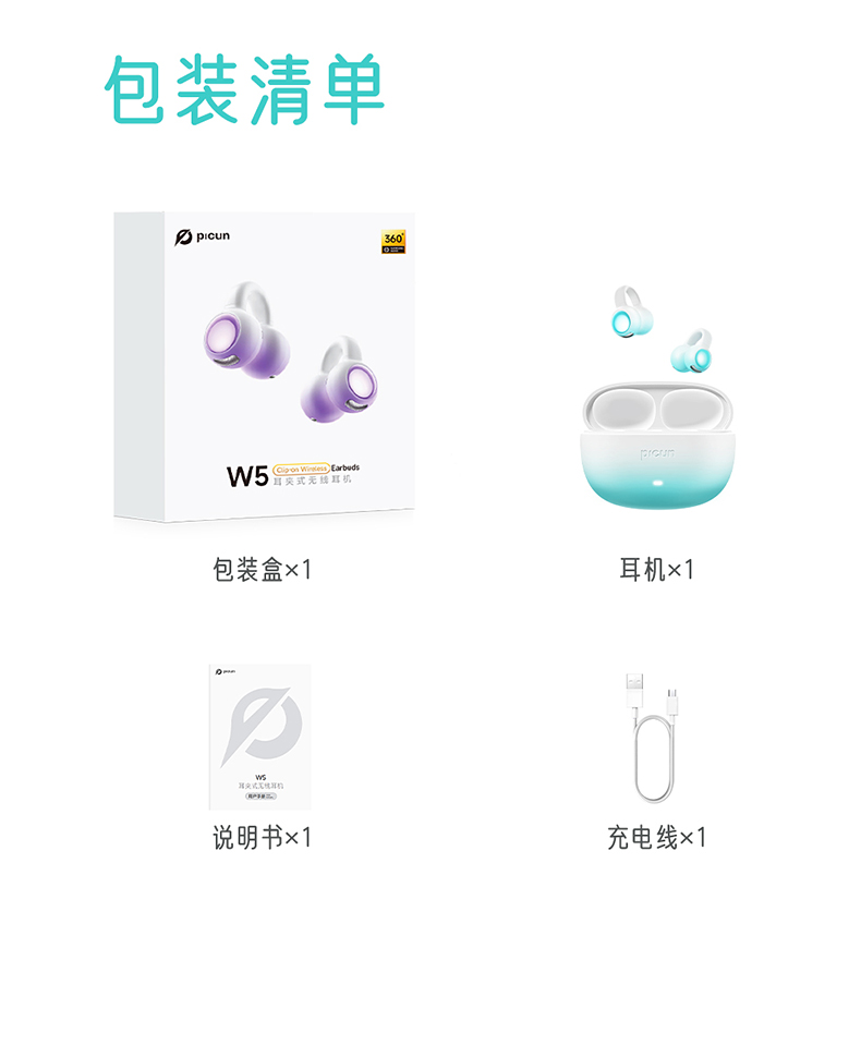 商品名称:品存(picun)防漏音个性化音效耳夹式降噪防丢耳机 W5曜石黑/白/青色/绿/粉/紫 6970604903806 偏远加运费