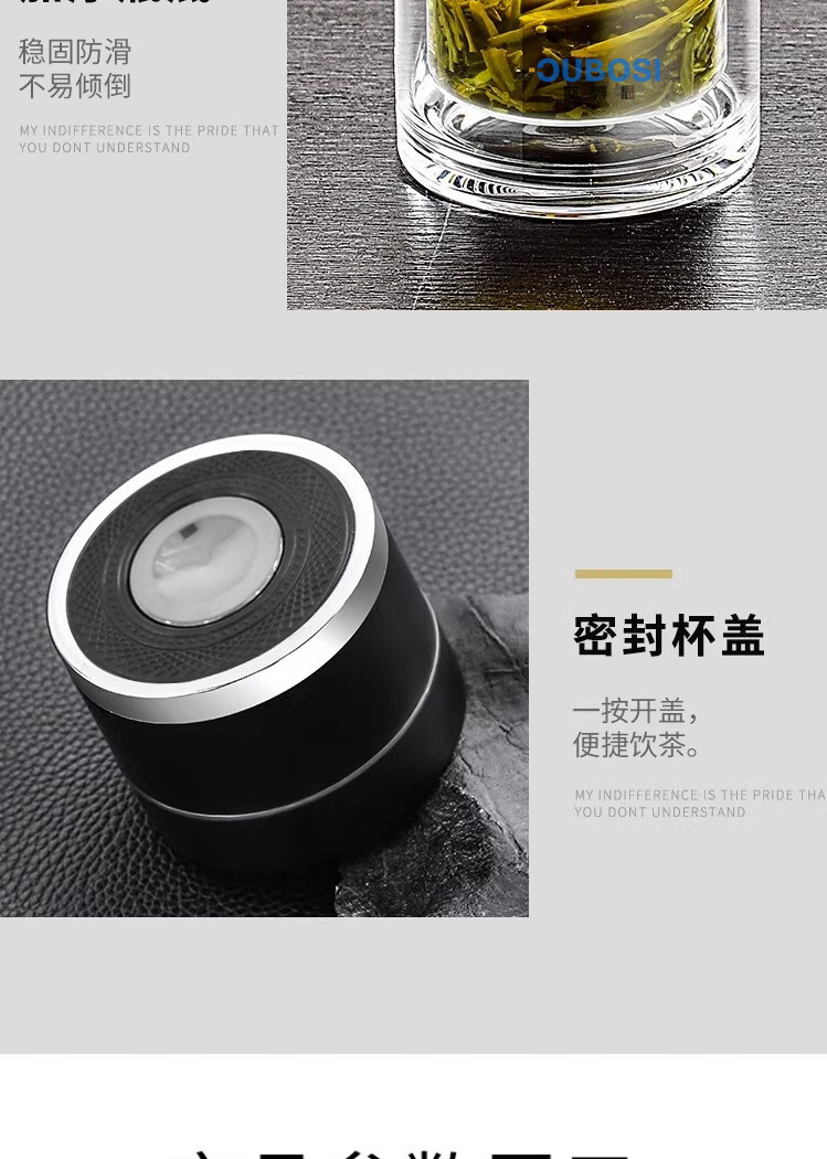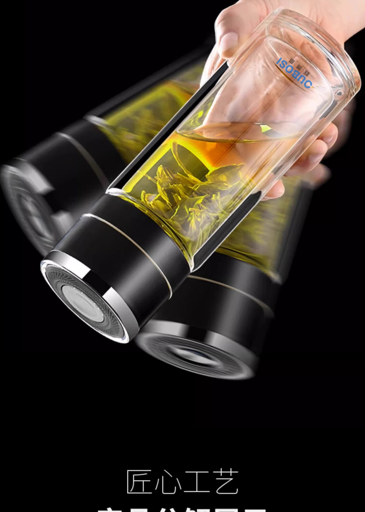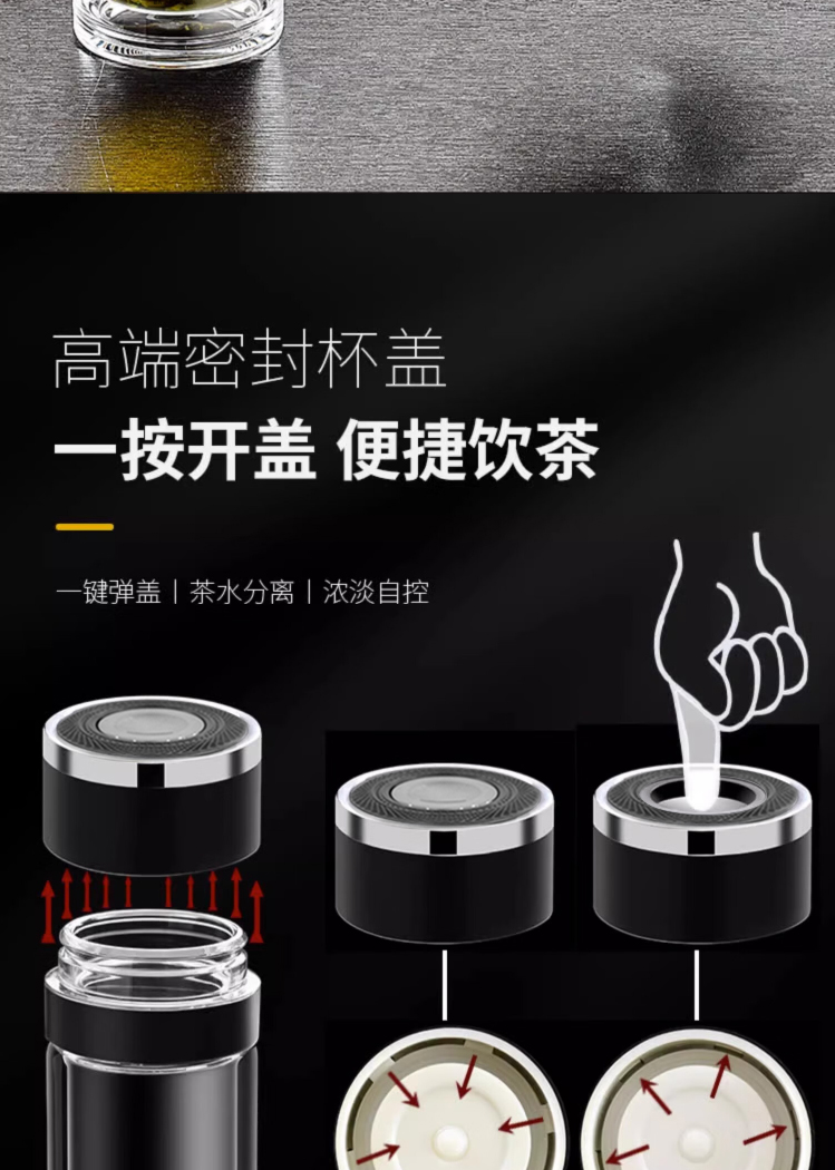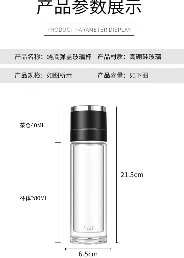 商品名称:S-欧博思 玻璃水杯车载一键开盖速开水杯茶水分离杯子双层隔热 J913 双色可选【箱规:40】 黑色