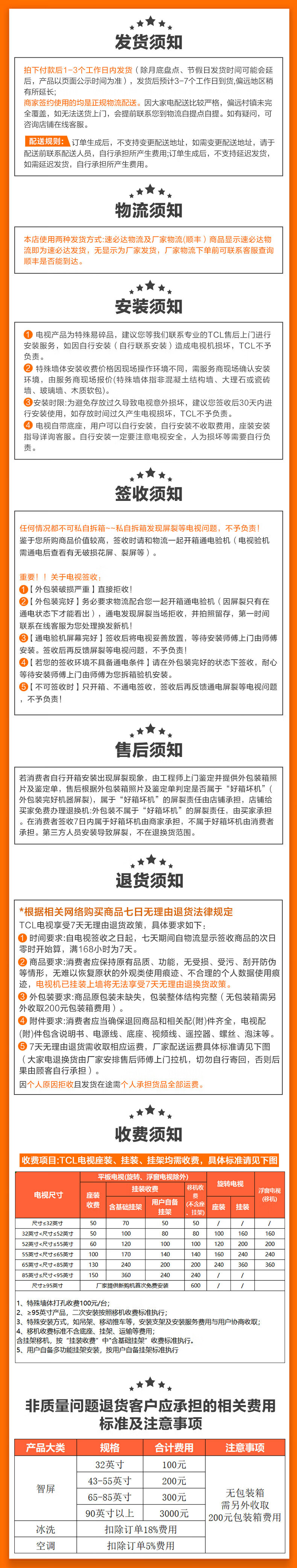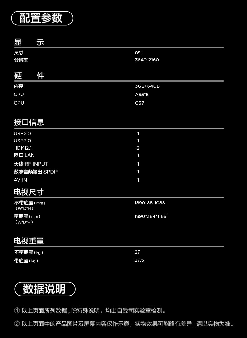 商品名称:J-普区地区包邮 TCL 85G60L 85英寸4K超高清电视 一级能效3+64GB 双频WIFI 远场语音支持方言 家用商用电视 85G60L