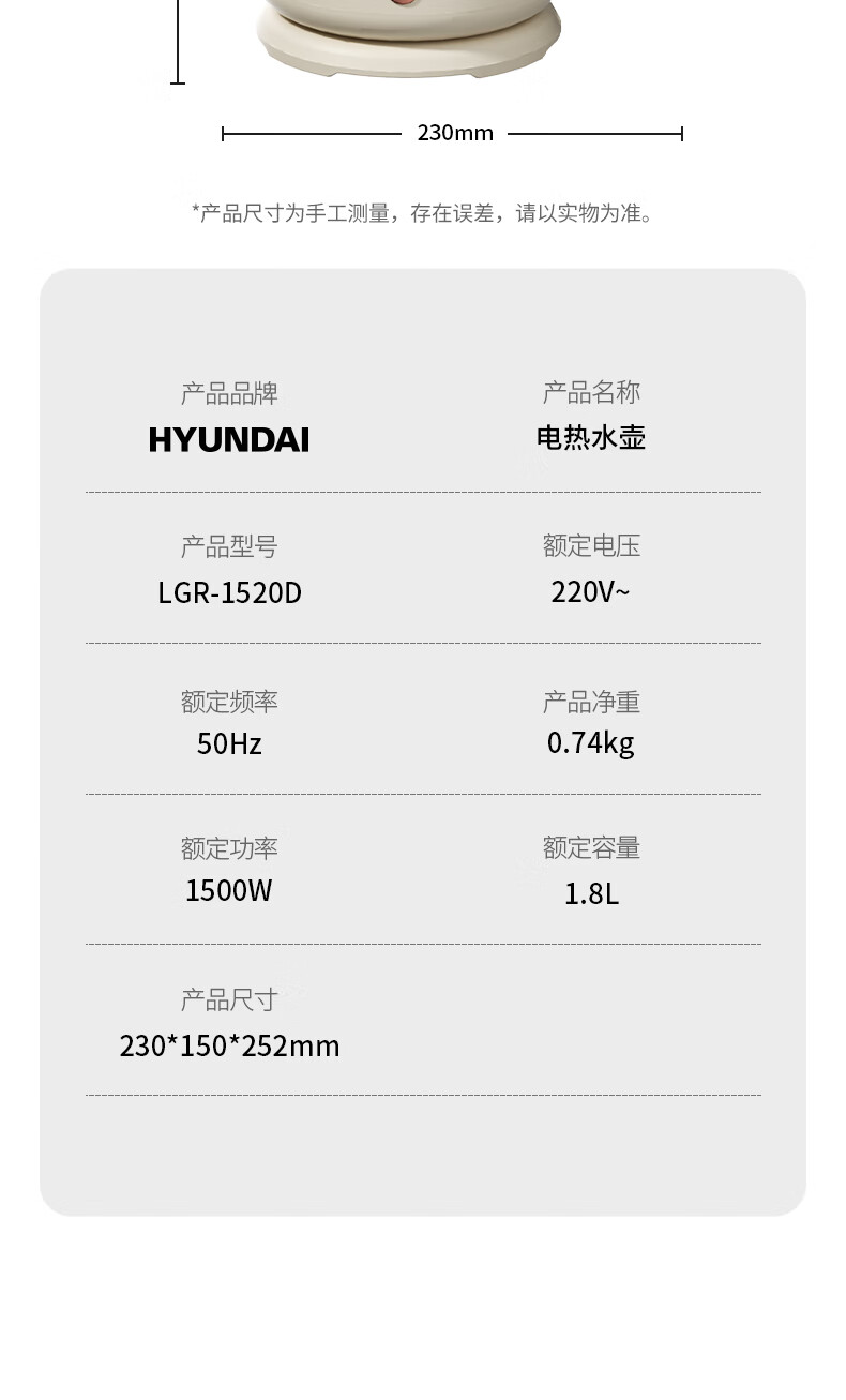 商品名称:HYUNDAI 韩国现代电热水壶 LGR-1520D