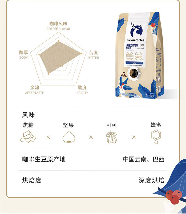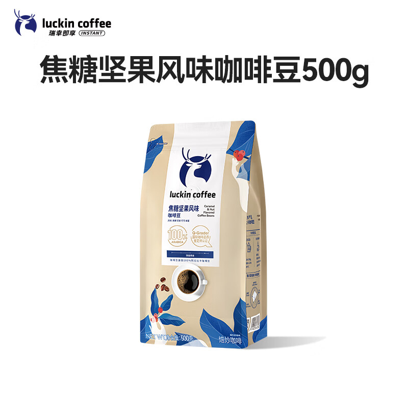 商品名称:瑞幸咖啡即享拼配焦糖坚果风味咖啡豆500g*20袋 整箱 深烘手磨粉醇香