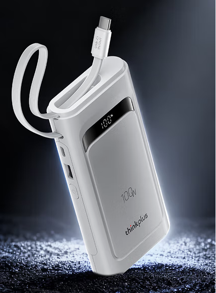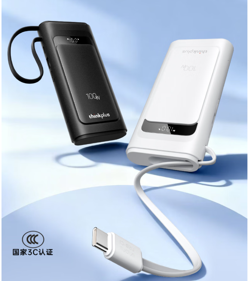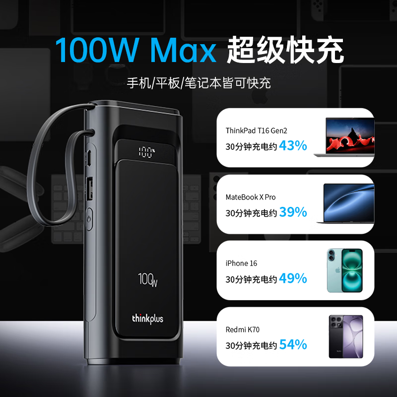 ThinkPlus联想【3C认证可上飞机】100W自带线充电宝10000毫安大容量快充移动电源适用苹果17华为小米笔记本 黑/白色