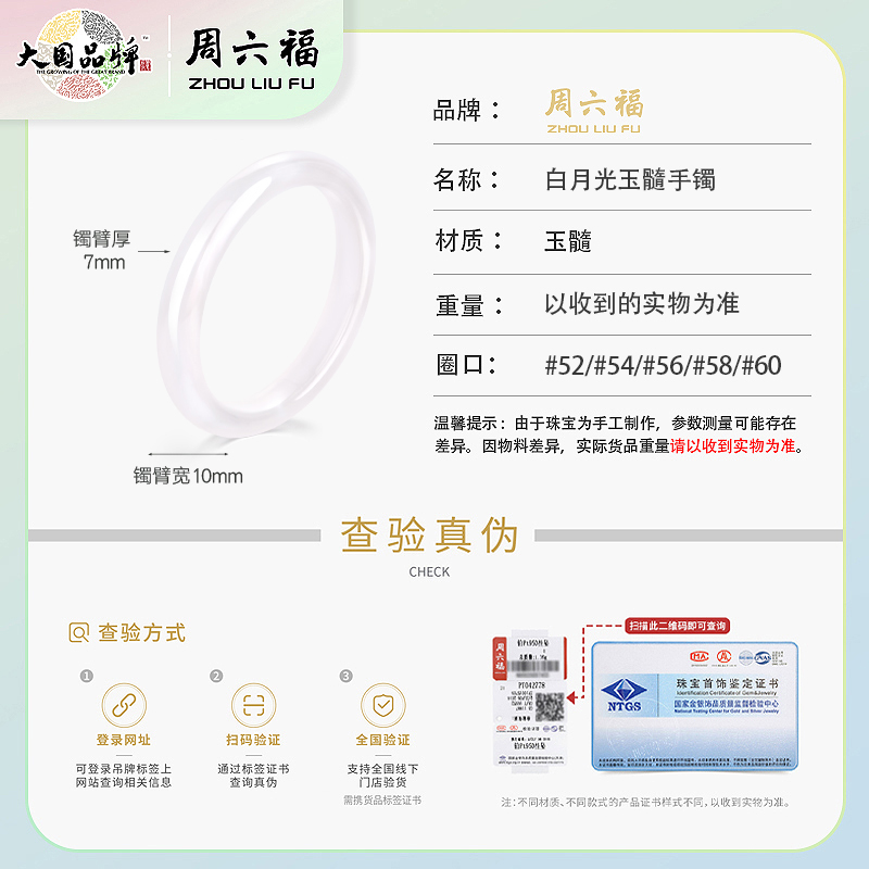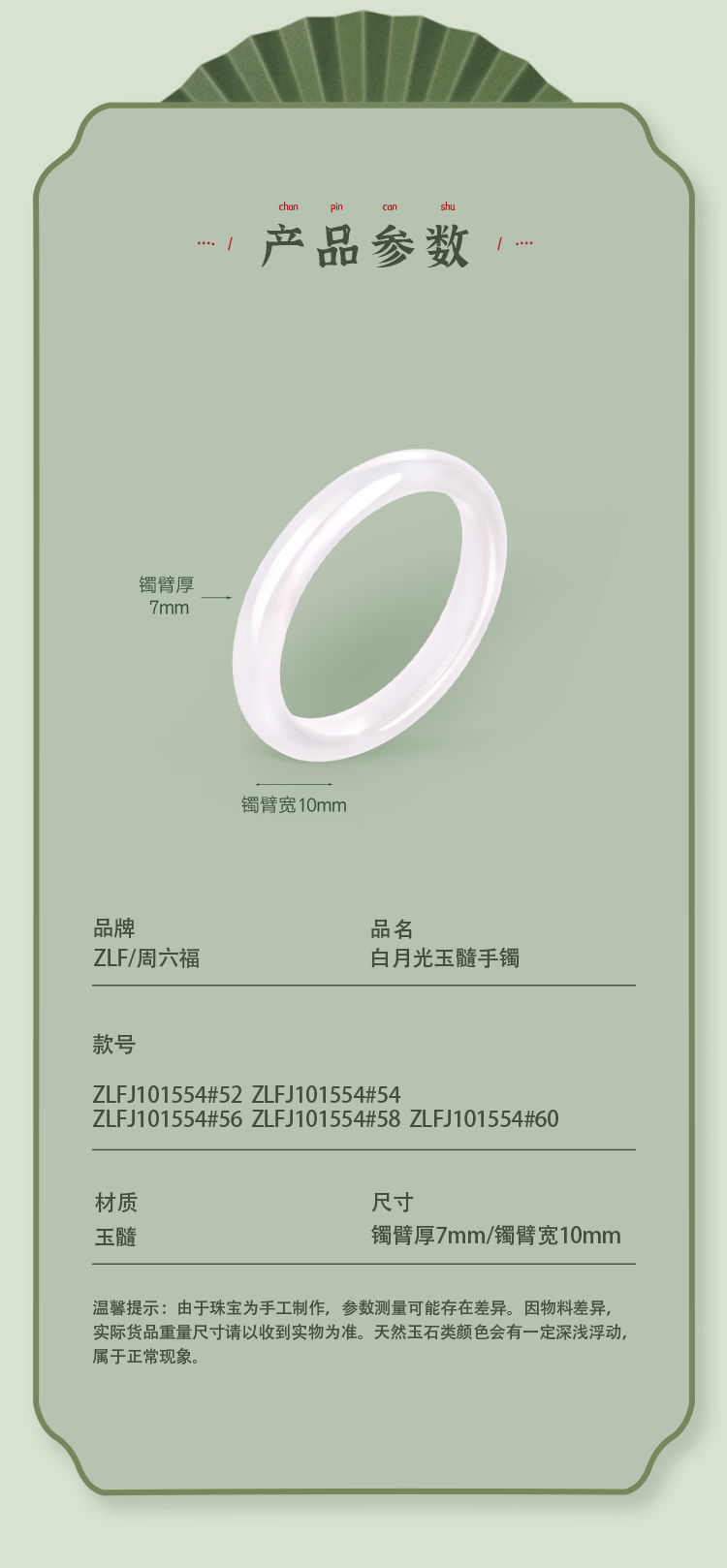 商品名称:周六福冰种玉髓镯ZLFJ101554,下单备注圈口大小54-60