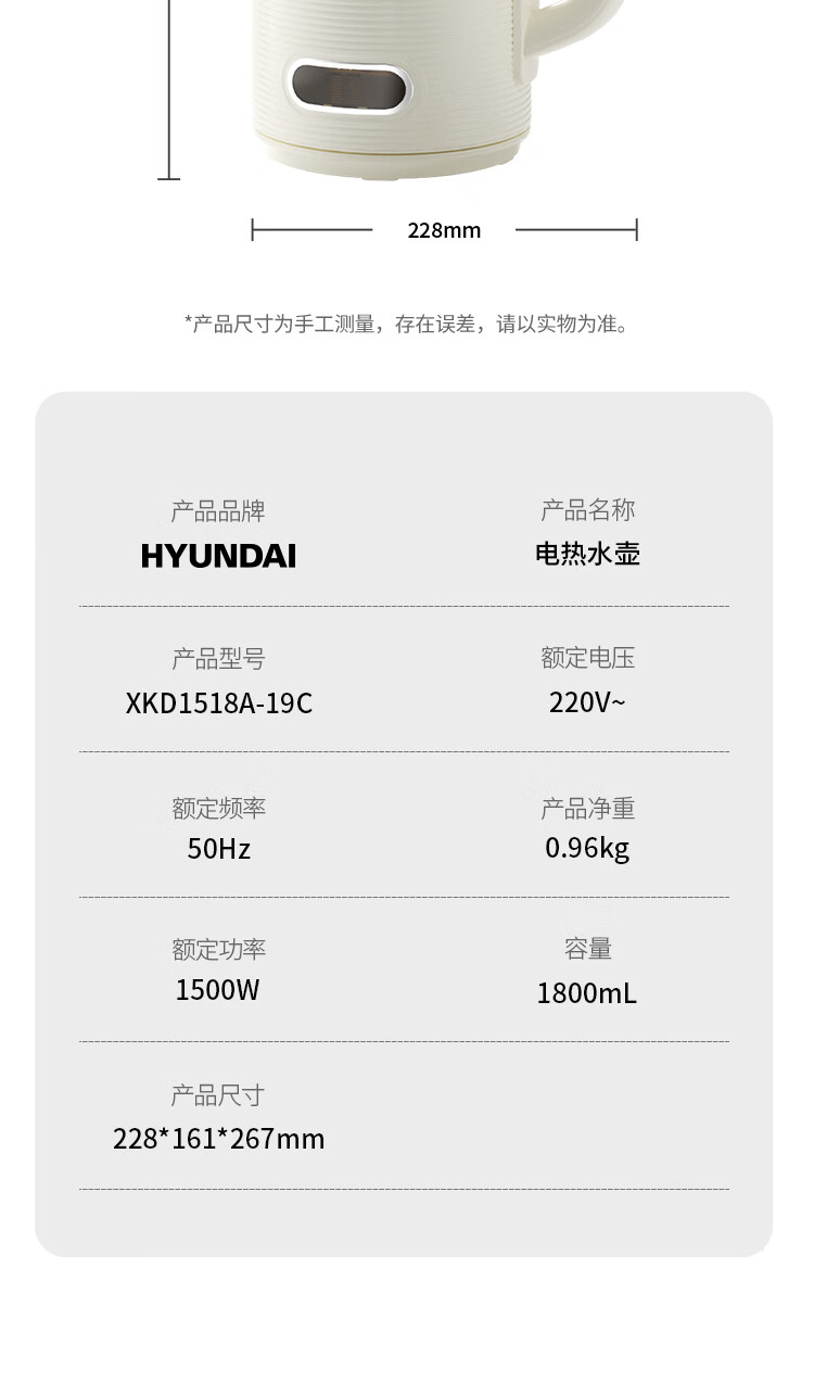 商品名称:HYUNDAI 韩国现代电热水壶 XKD1518A-19C