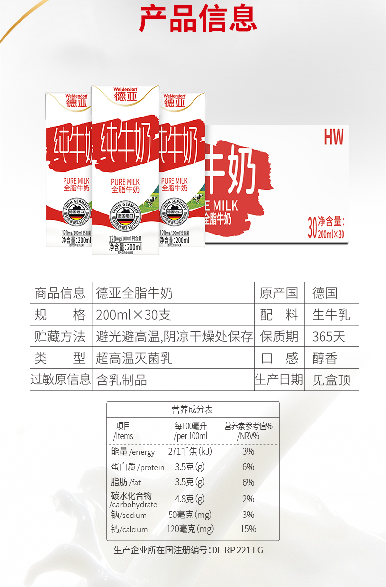 商品名称:德亚全脂牛奶 200ml*30盒 3200856 偏远另加运费