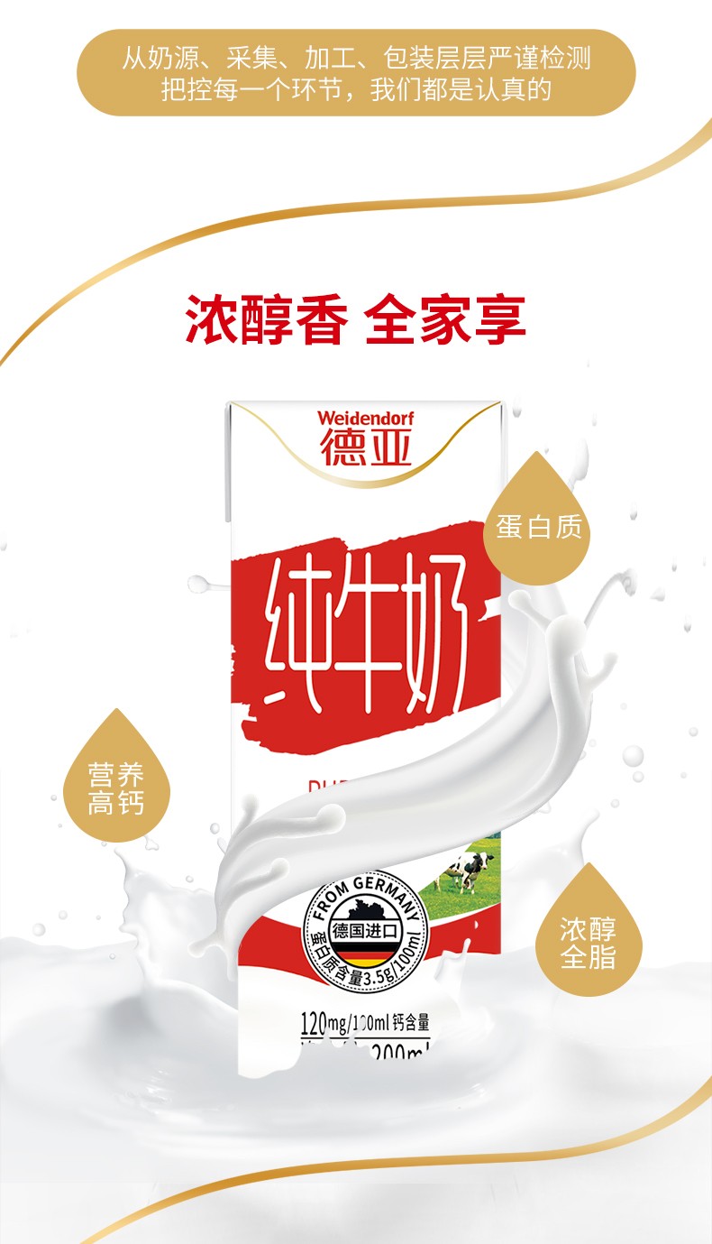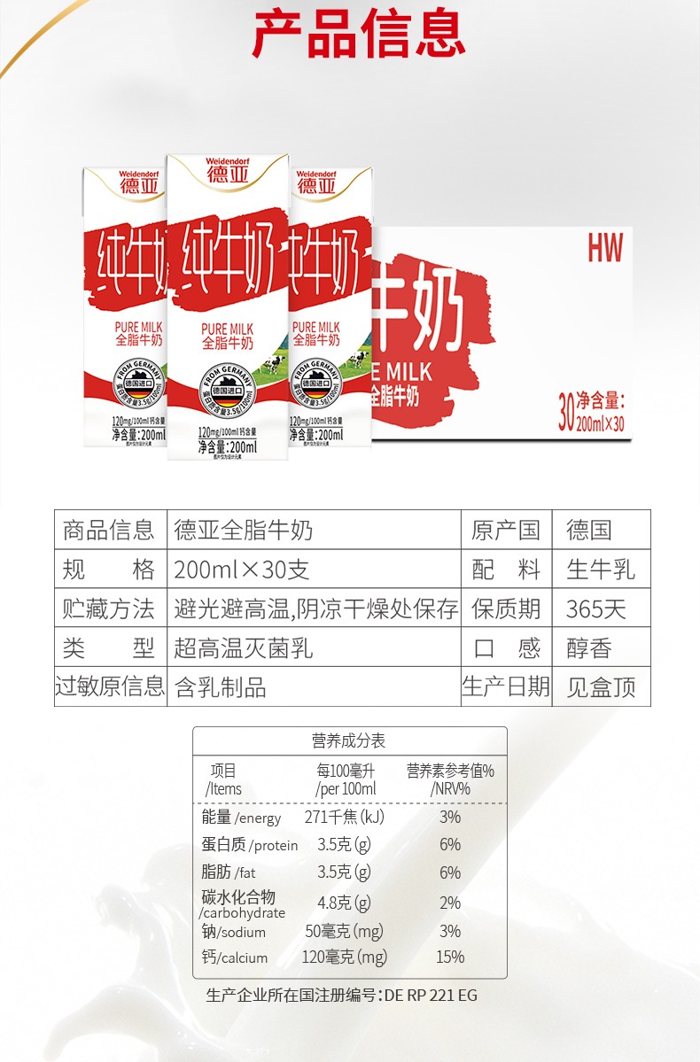 德亚全脂牛奶 200ml*30盒 3200856 偏远另加运费