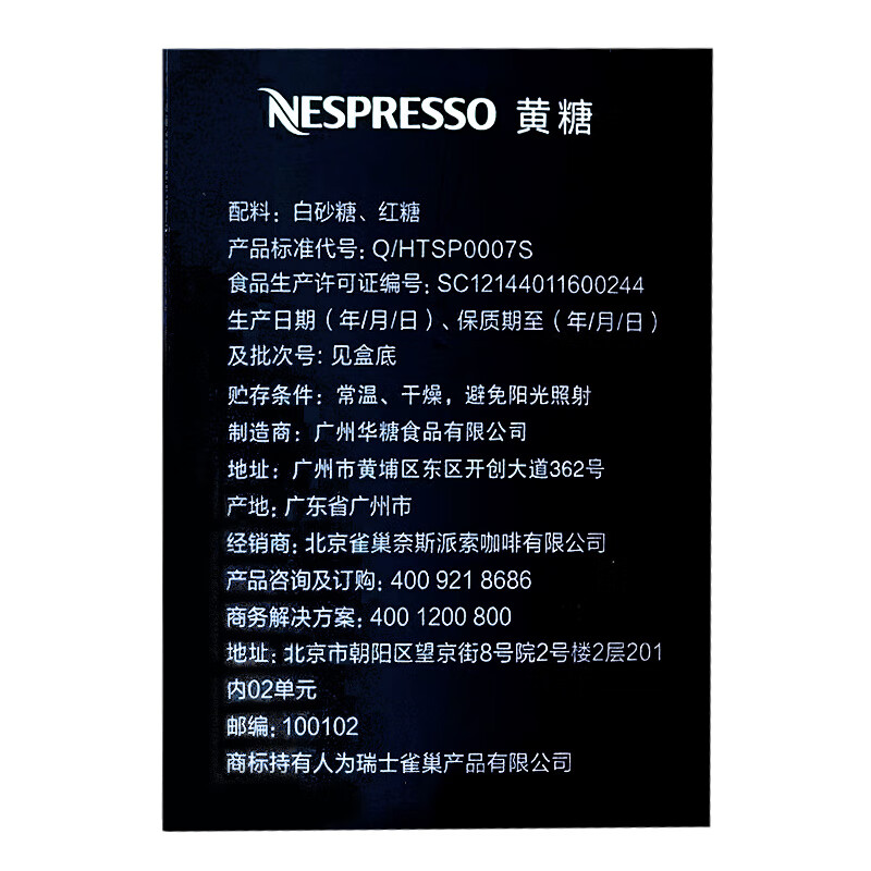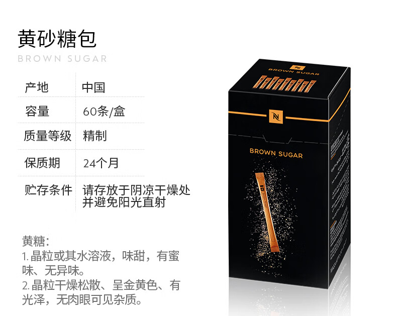 商品名称:Nespresso奈斯派索 黄糖条 咖啡伴侣 黄糖包 高级袋装方便搭配胶囊咖啡 60条/盒