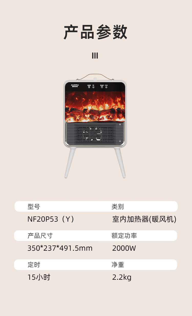 商品名称:澳柯玛语音控制仿真火焰2000w塔式2档加热暖风机NF20P53(Y)