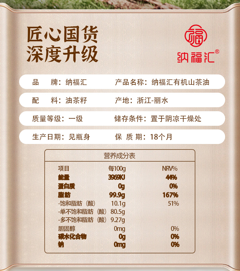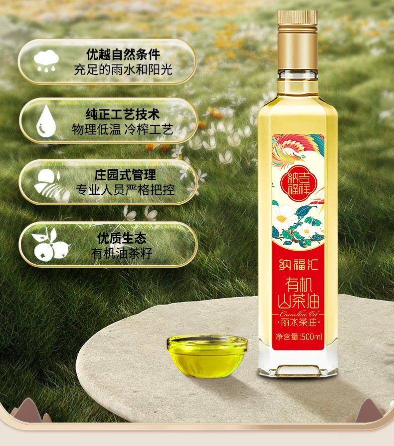 商品名称:纳福汇有机山茶油500ml 纯正茶油冷压榨一级食用油丽水茶油【纳福吉祥】 6974802983332新疆西藏内蒙青海宁夏不发货