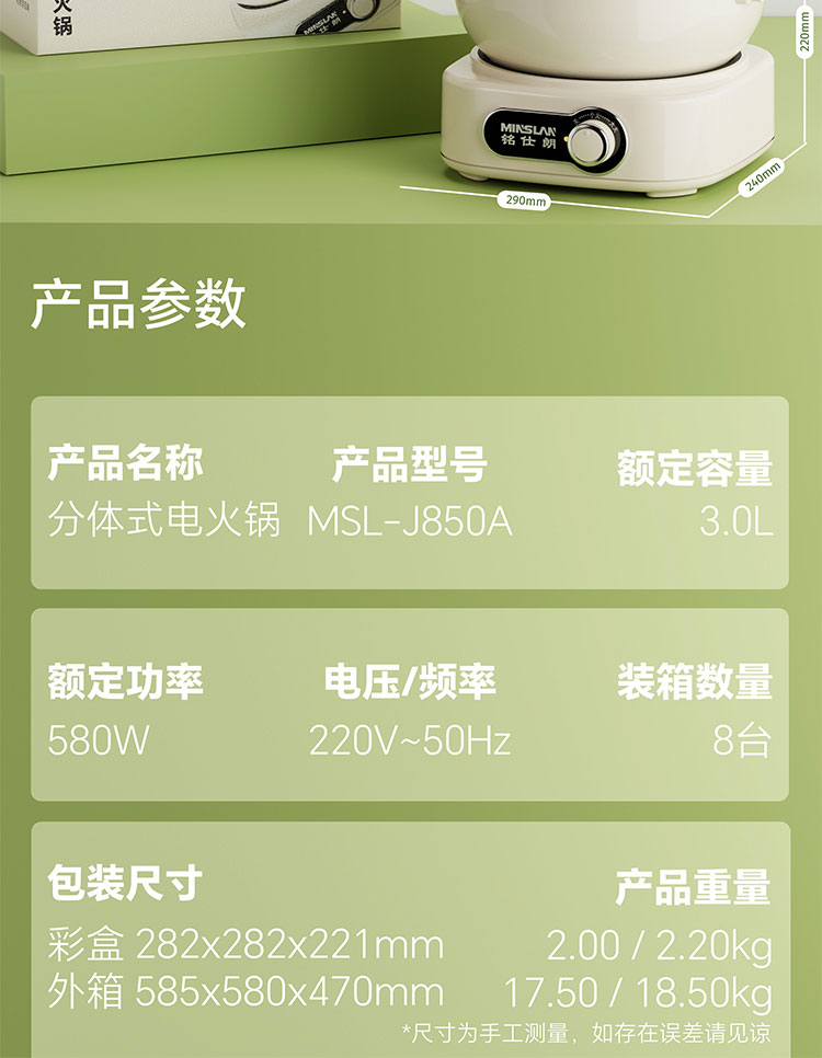 商品名称:铭仕朗(MINSLAN) MSL-J850A 多功能分体式电火锅早餐家用便捷电煮锅 6977411130647