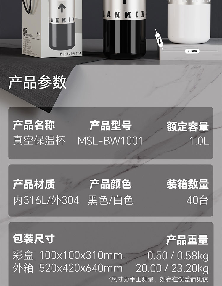 商品名称:铭仕朗(MINSLAN) MSL-BW1001 大容量不锈钢保温水杯户外运动水杯 1.0L 6977411130531