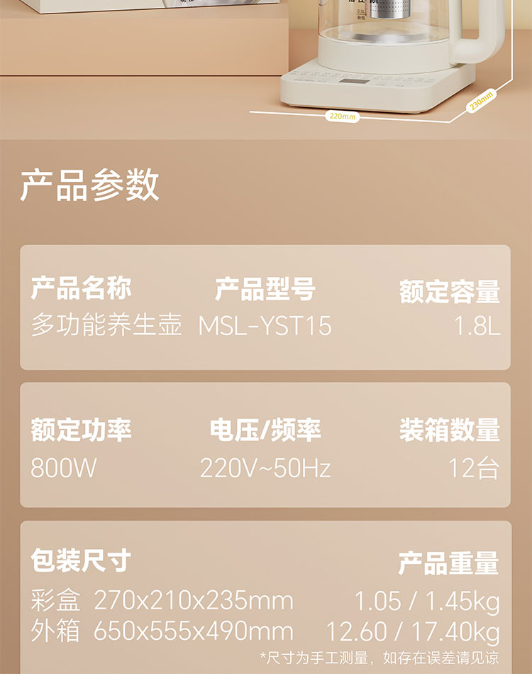 商品名称:铭仕朗MSL-YST15多功能养生壶1.8L 6977411130609