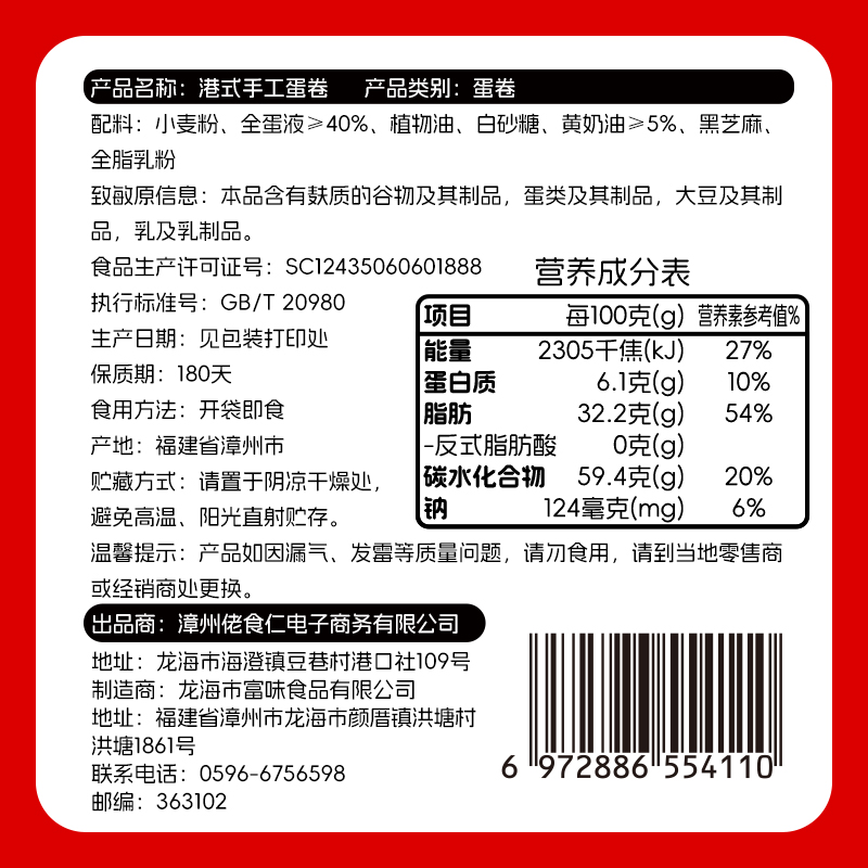 商品名称:佬食仁港式手工蛋卷150g/10包