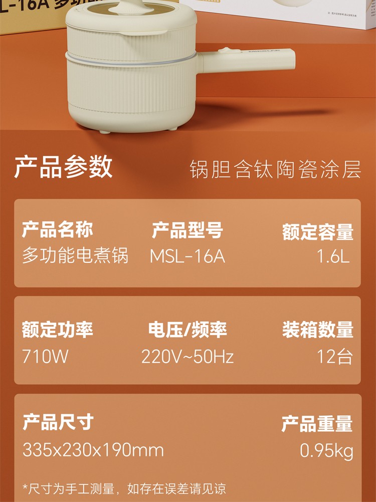 商品名称:铭仕朗 电煮锅家用多功能宿舍学生电锅蒸煮炒焖电炒锅一人食电火锅巧致小暖锅. MSL-16A 乳白色 1.6L 6977411130180