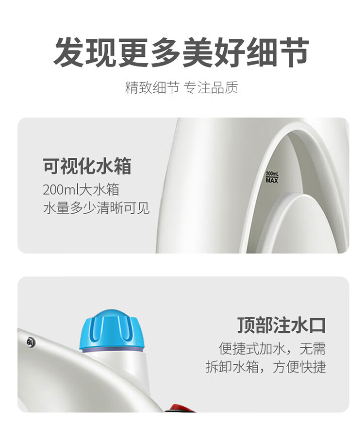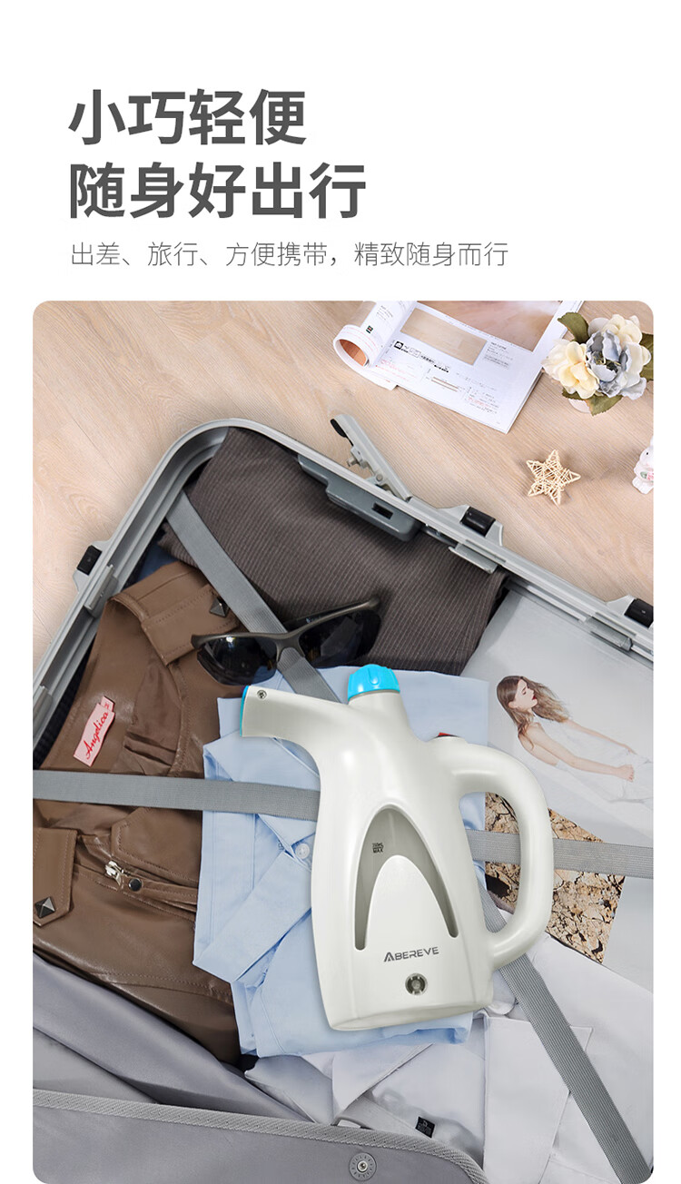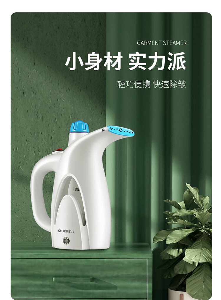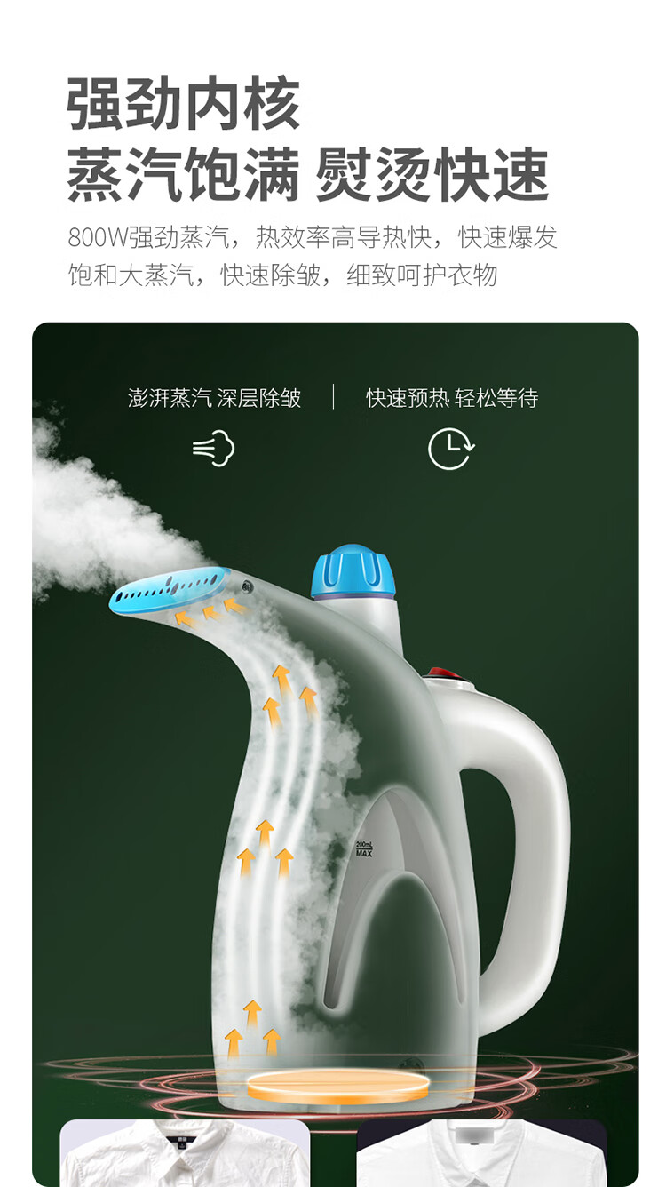 大功率快速出汽,大蒸汽量 轻松应对各类衣物 迷你便携,出差旅行家用都合适 一机多用,杀菌除尘,蒸脸美容,平整熨衣