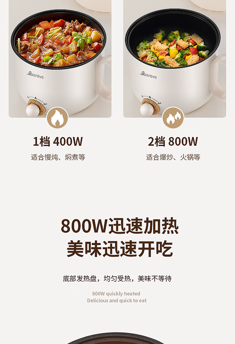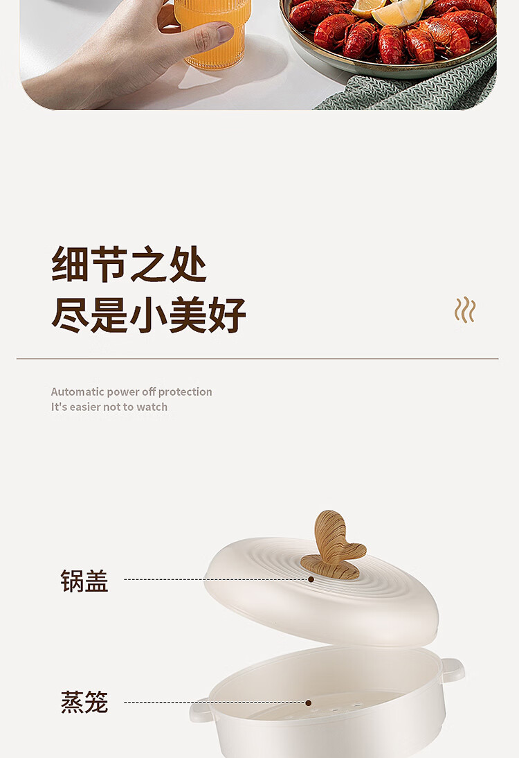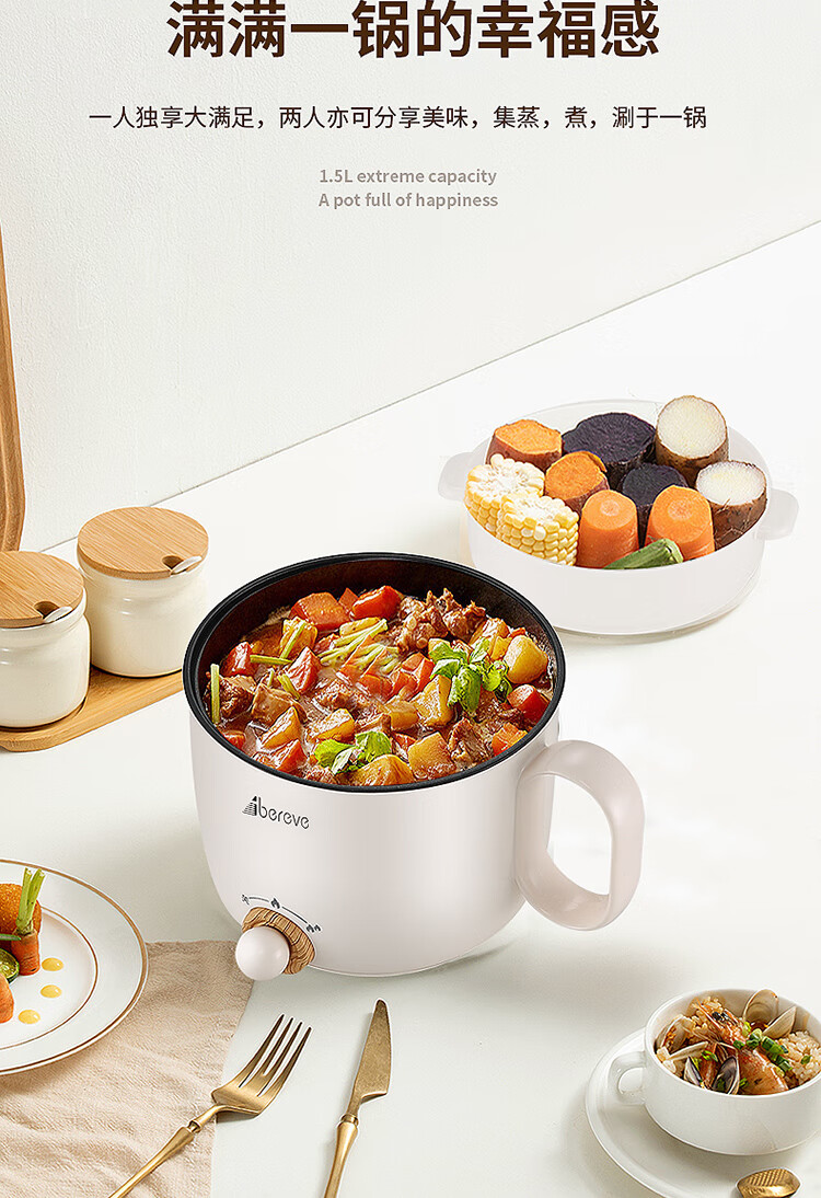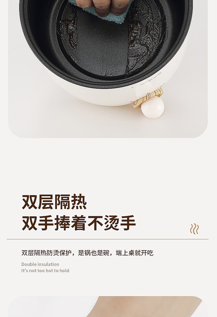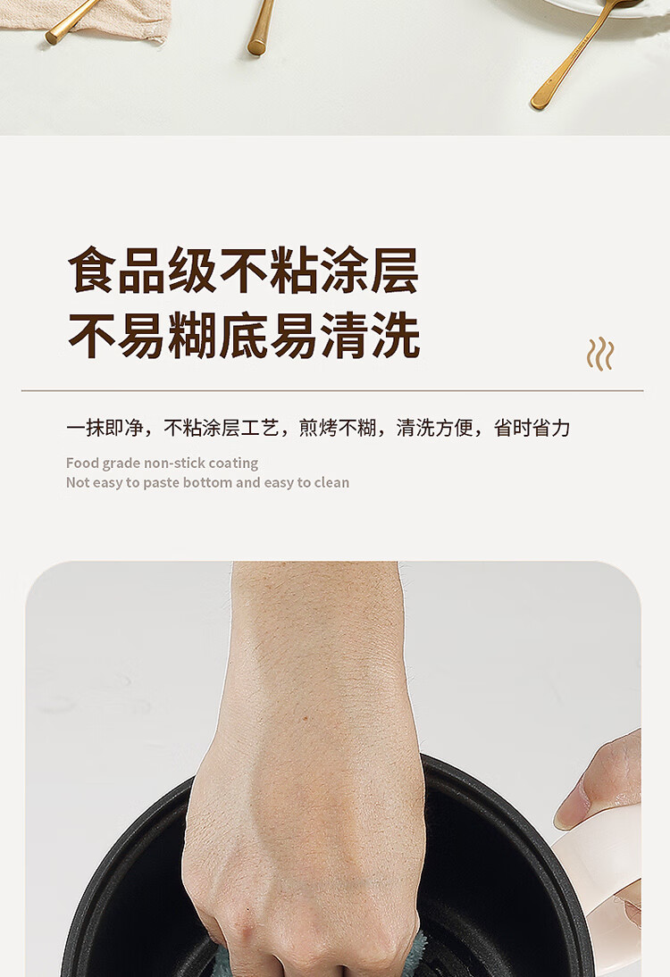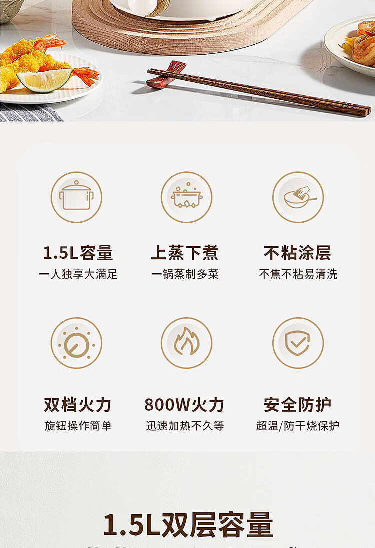 1.5L极致容量,一人独享大满足,两人亦可分享美味,集蒸,煮,涮于一锅 食品接触级耐磨不粘内锅涂层,不粘油渍,不易糊底
