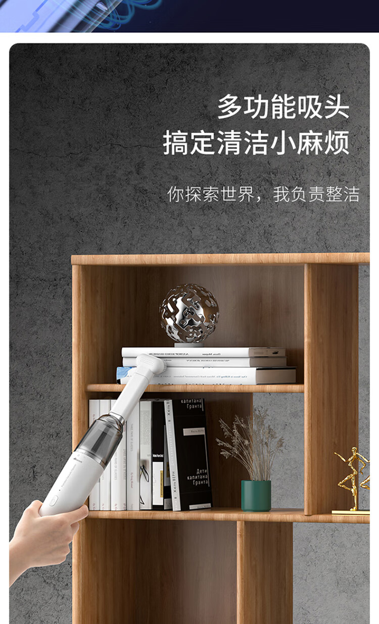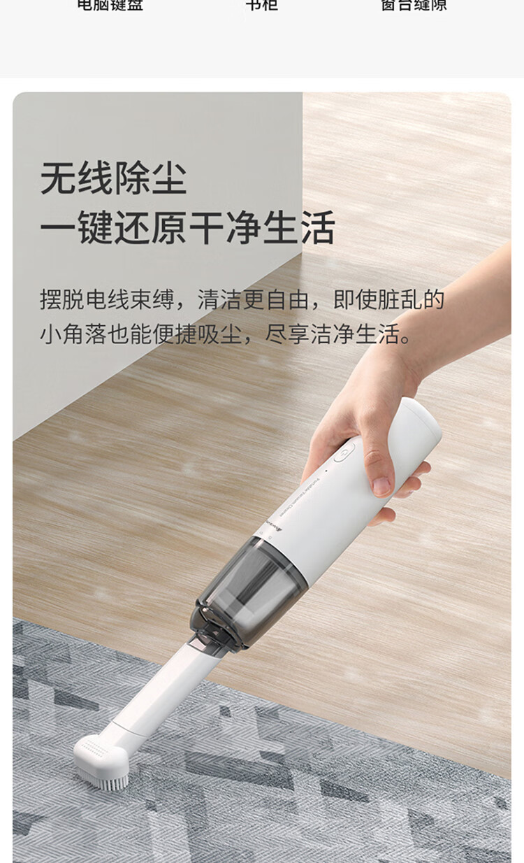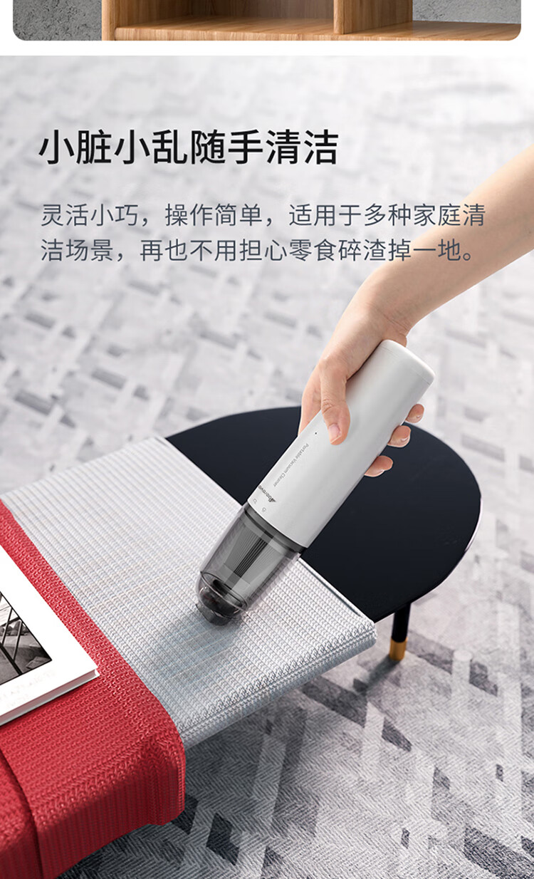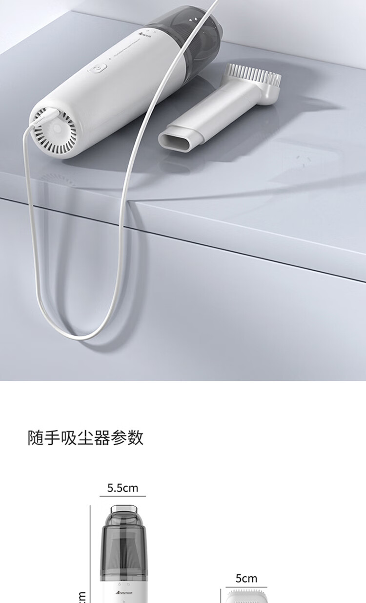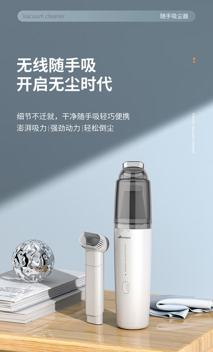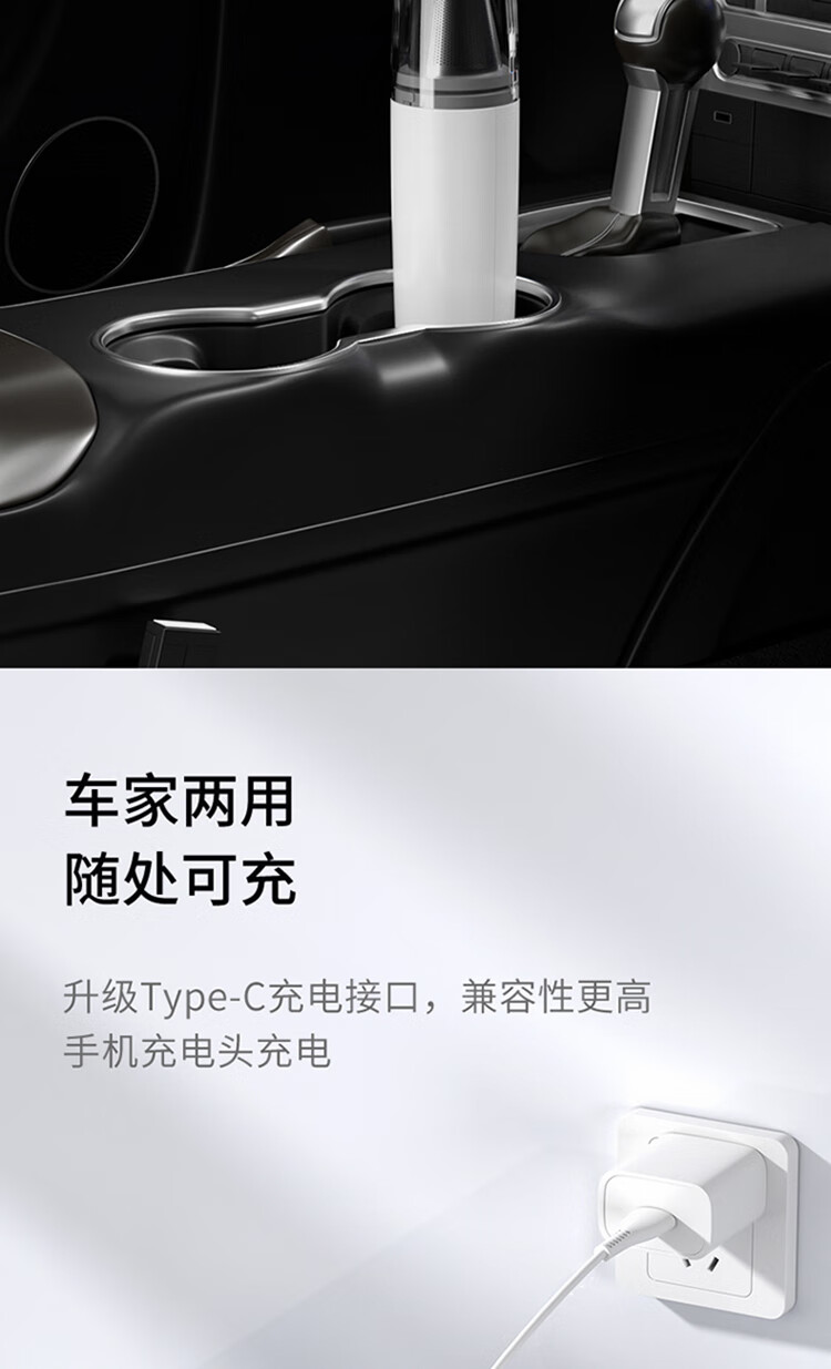 无线除尘,可与手机移动电源数据线通用 多功能吸头,快速倒尘 外形灵活小巧,家车两用