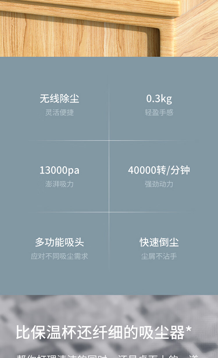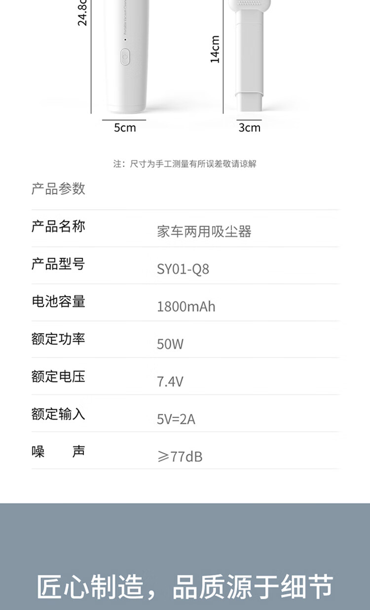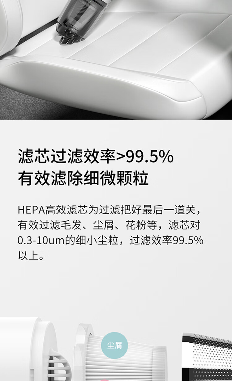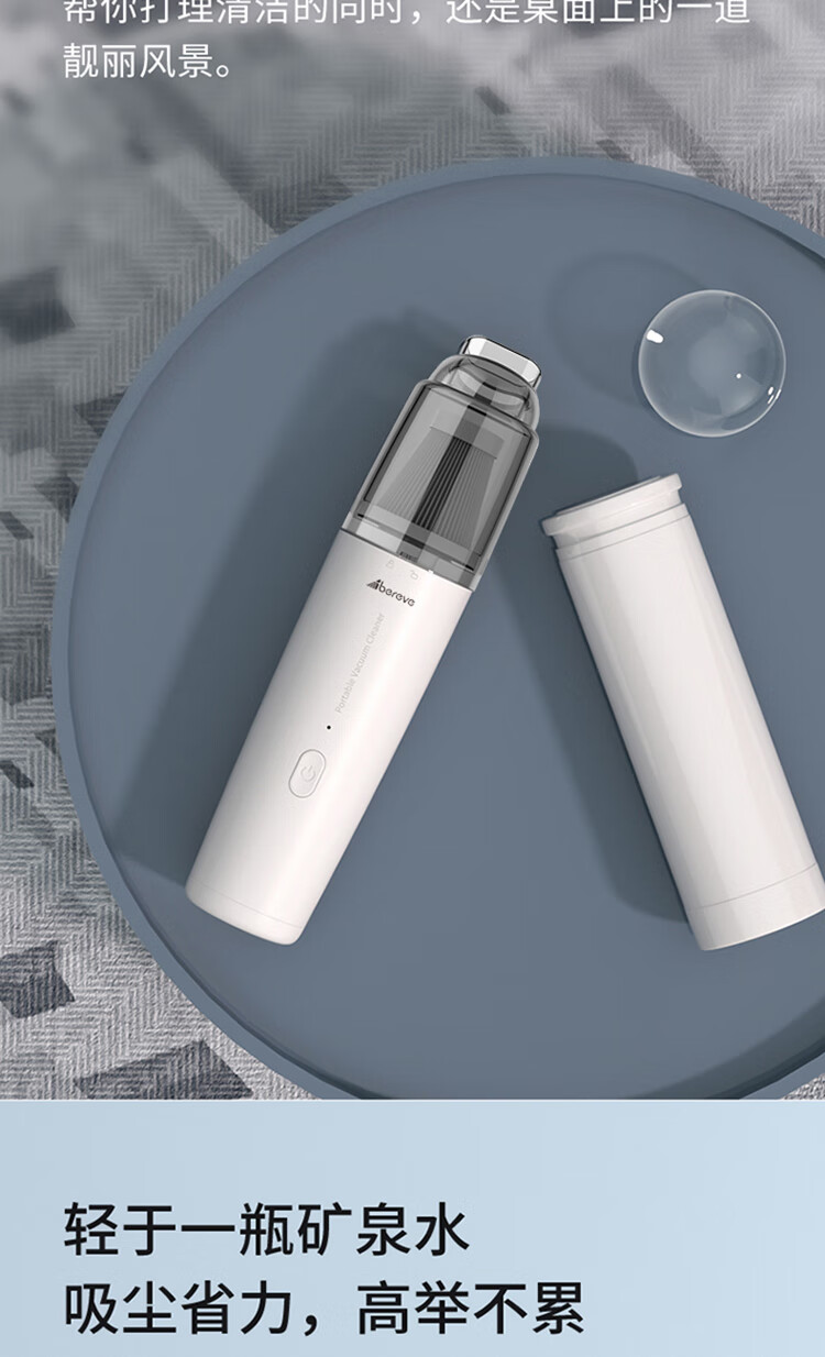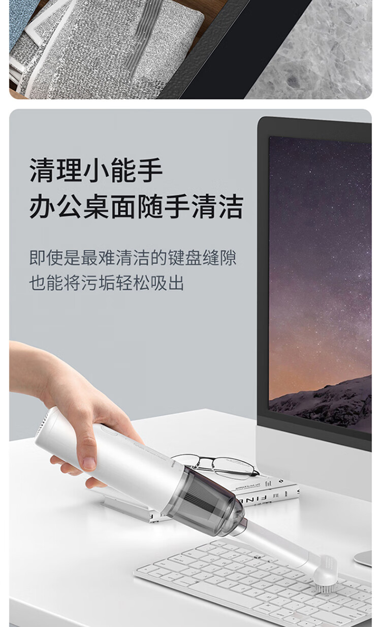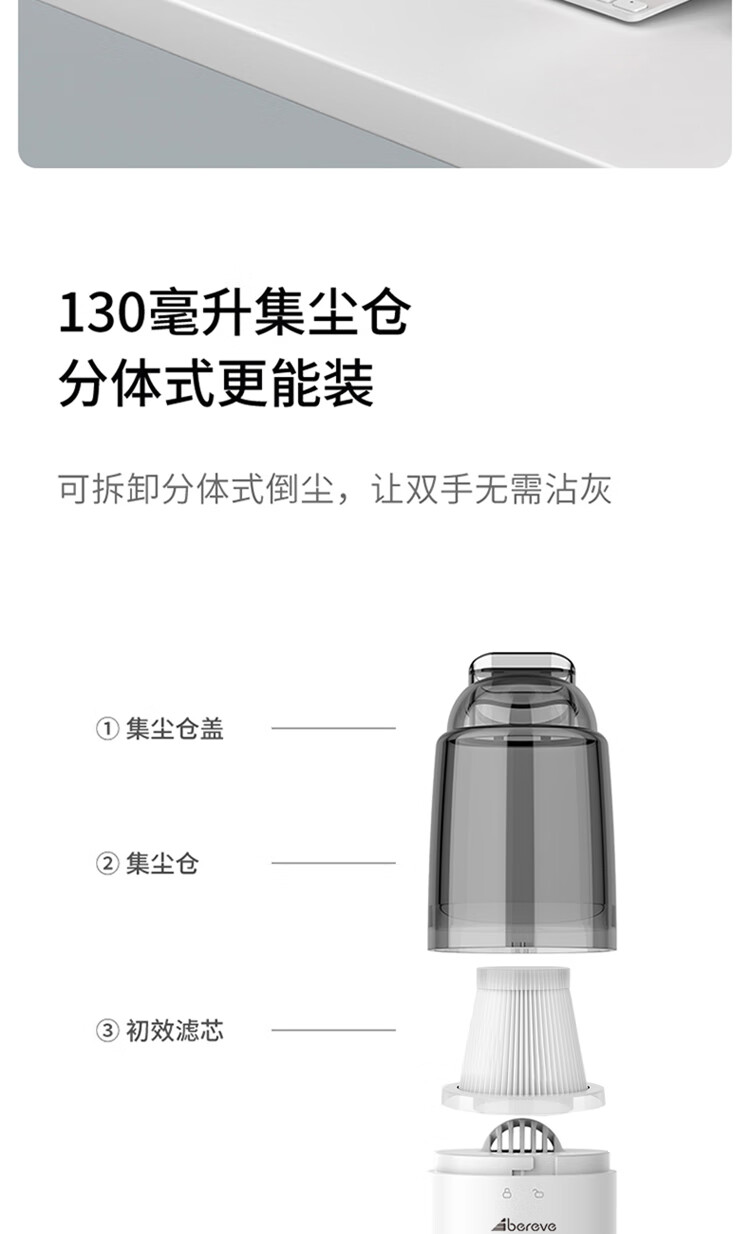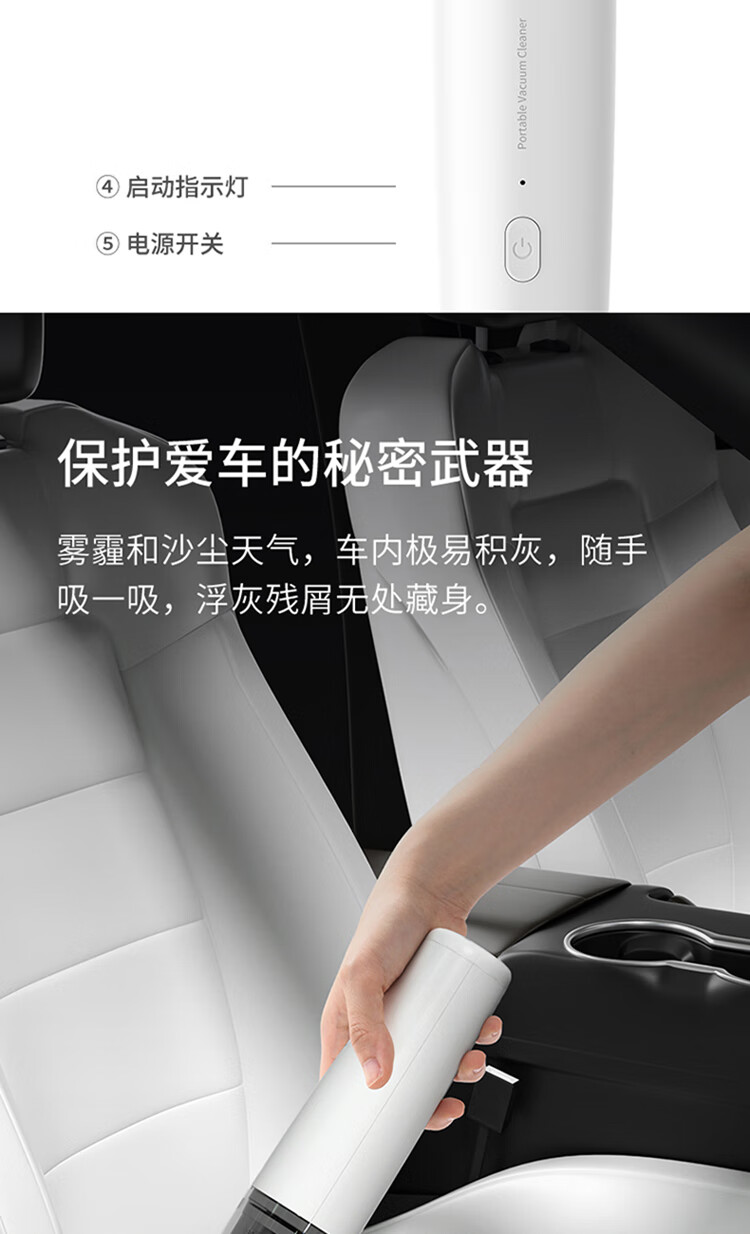无线除尘,可与手机移动电源数据线通用 多功能吸头,快速倒尘 外形灵活小巧,家车两用