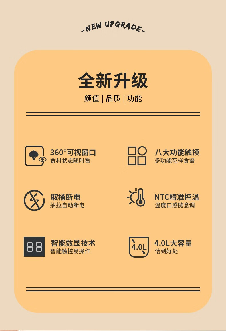 \\\\\\\"360度可透视内胆,颜值高 智能触控设计、8大功能、高端易操作 机身全塑PP健康材质、机身厚重、体验感优良