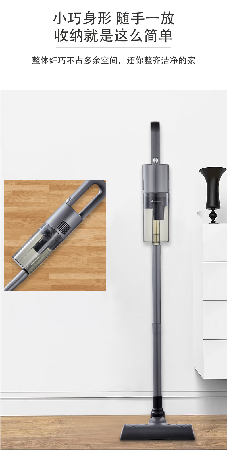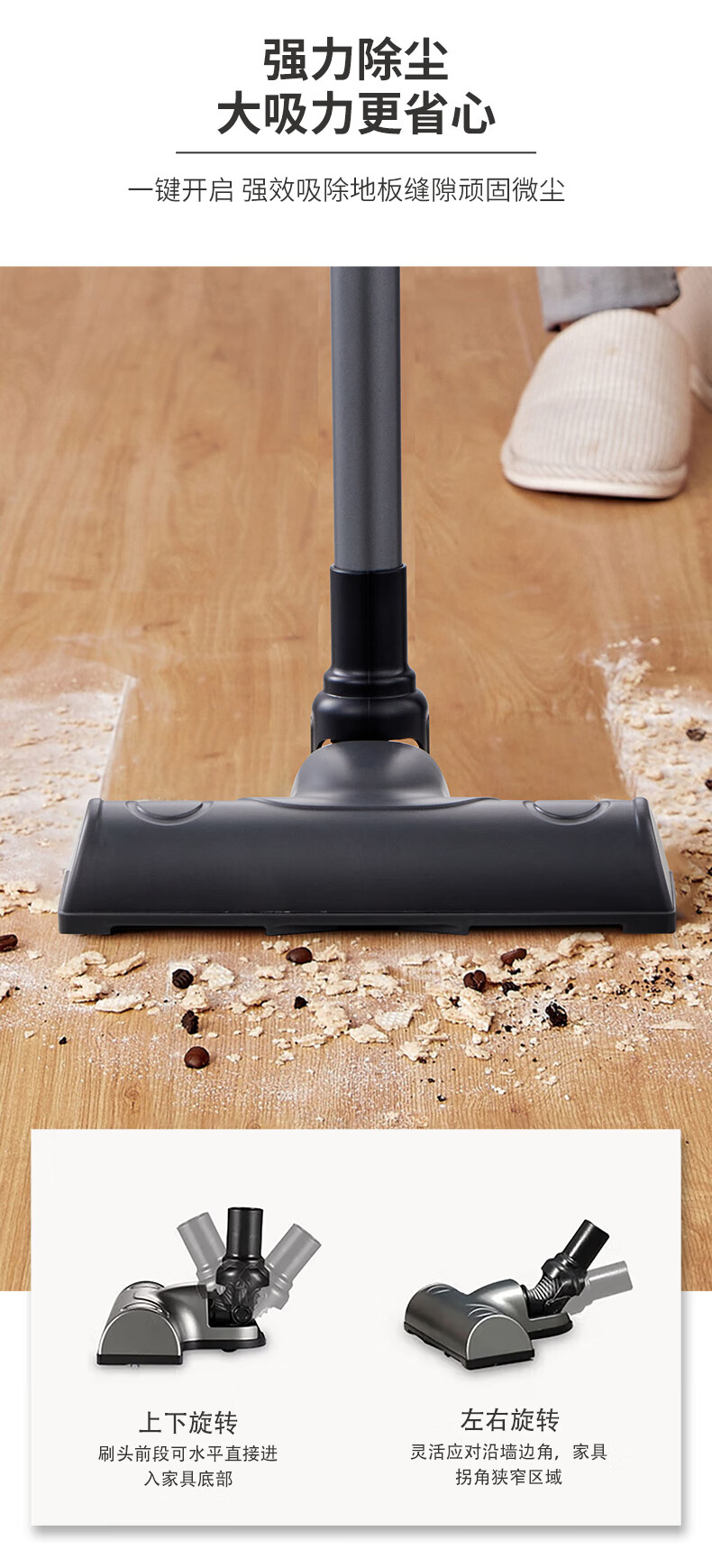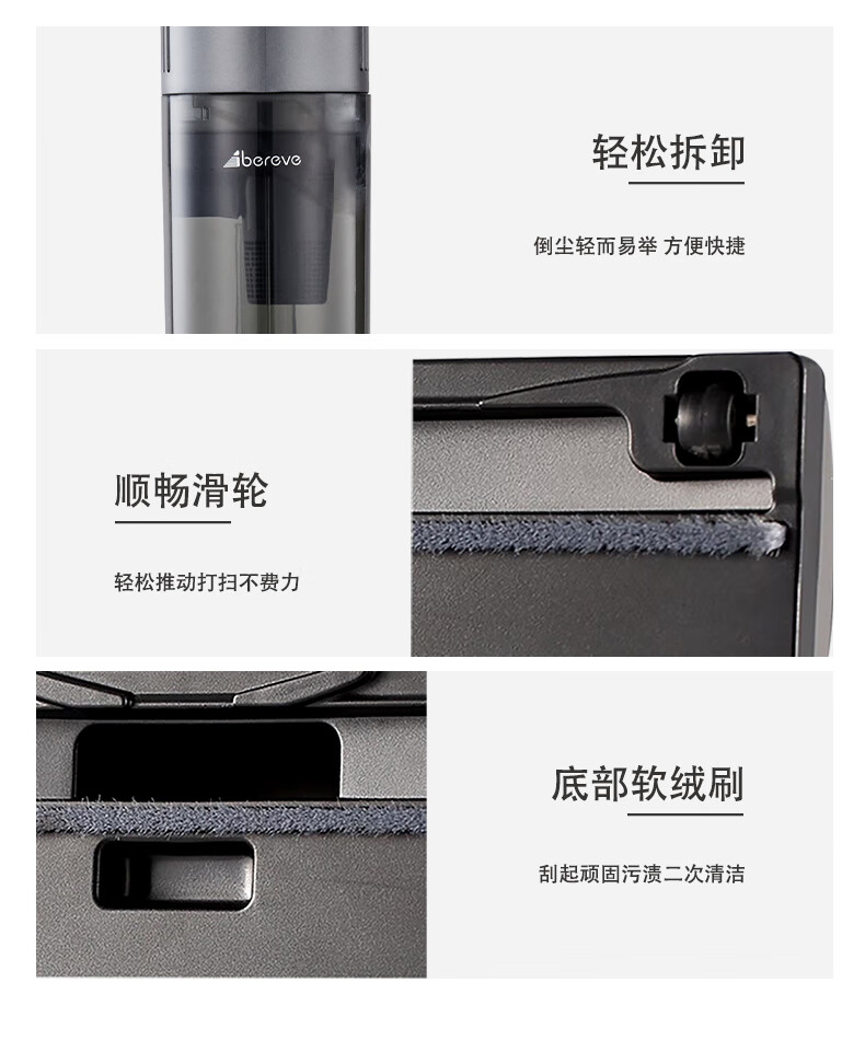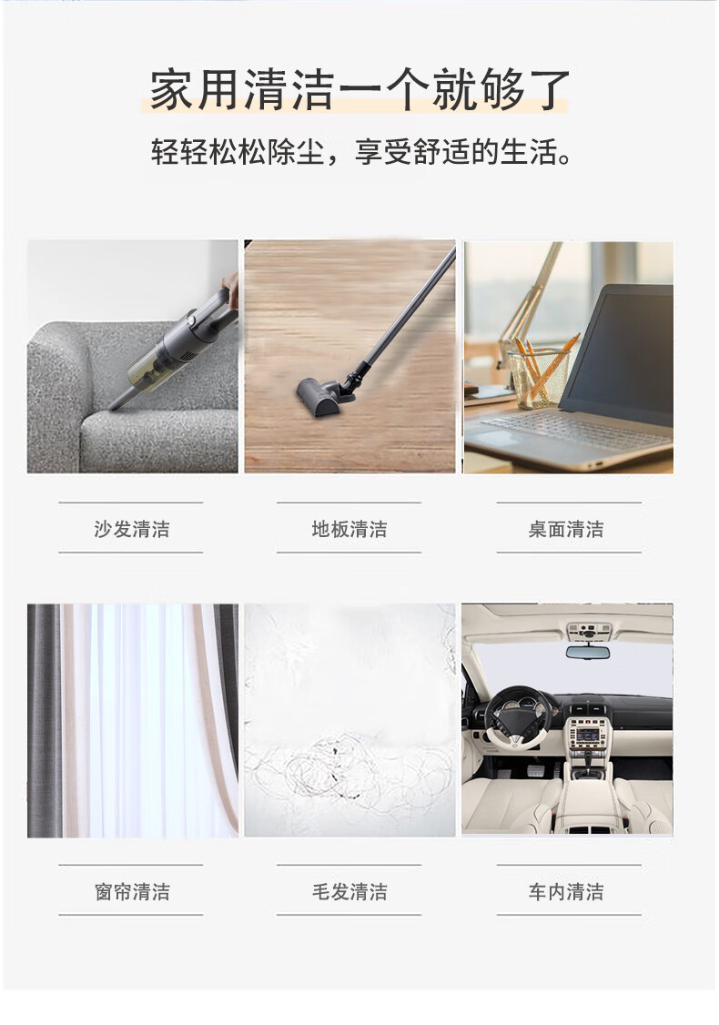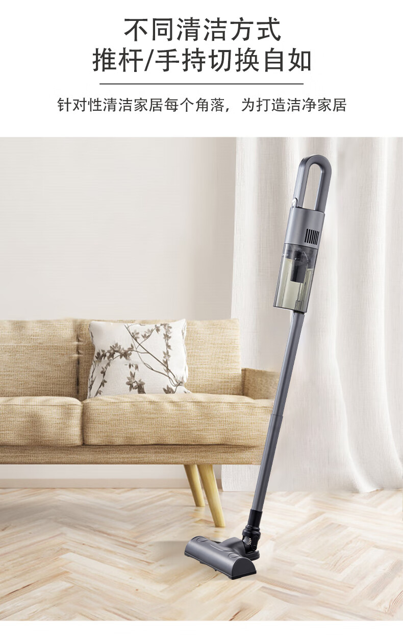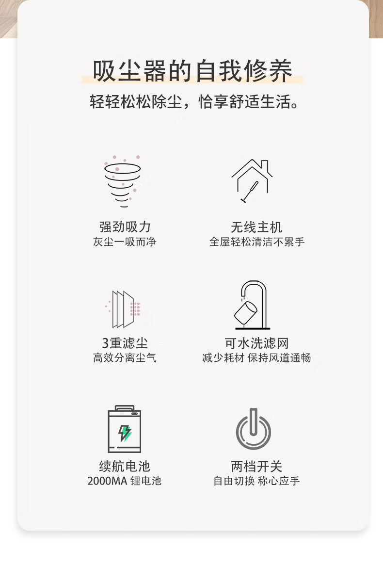 无线2合1,可变换的刷头和管 可洗高效滤网,旋风吸 轻量化设计,易操作 2000MA 锂电池