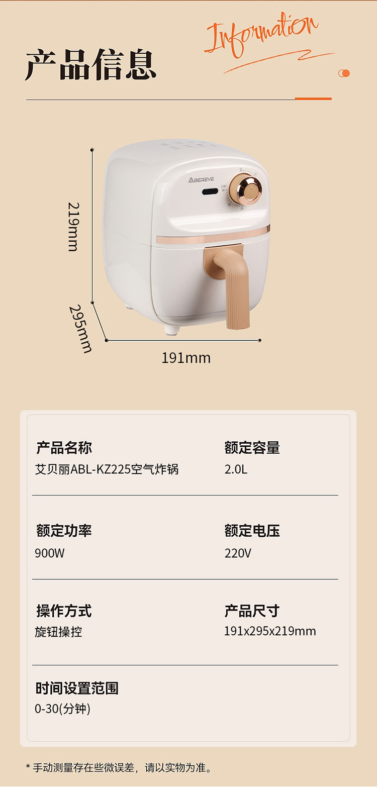 商品名称:艾贝丽空气炸锅 2L ABL-KZ225 6972149933324 偏远另加运费