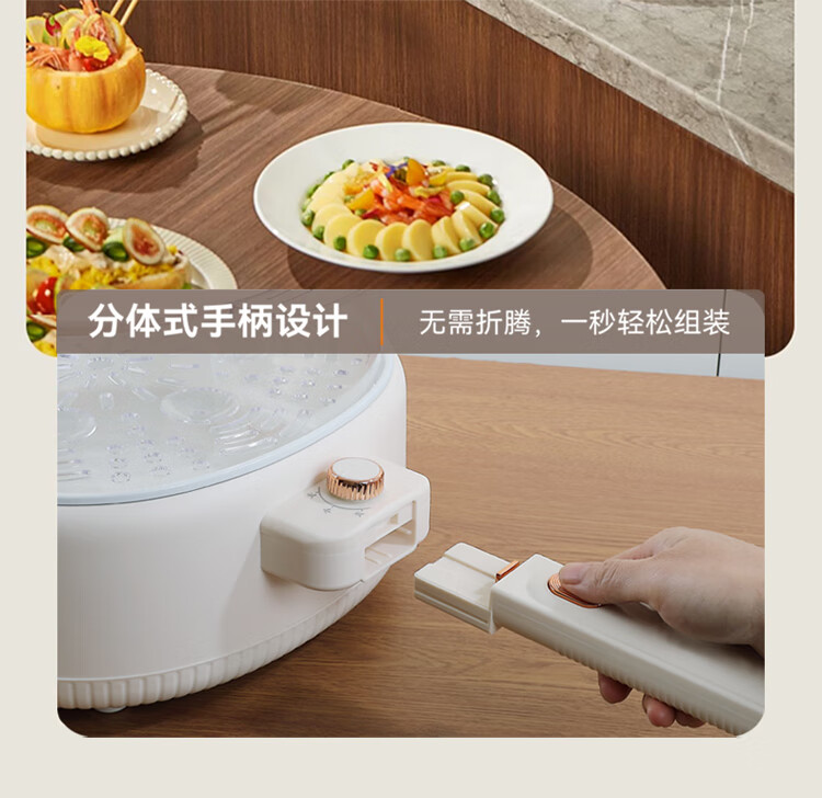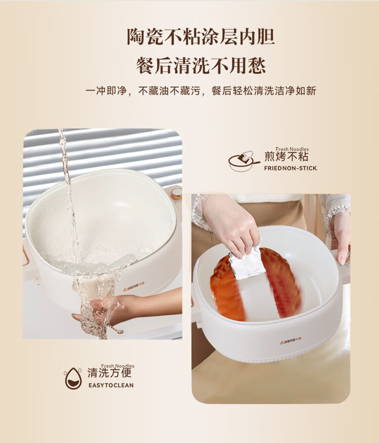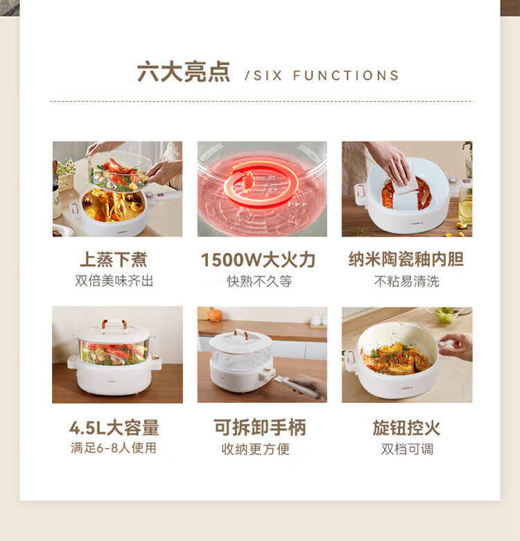 采用陶瓷秞不沾喷涂工艺,蒸格PC材质,盖子钢化玻璃。 整个产品设有(火锅/爆炒/蒸锅)三种常用功能。各种美食都能满足