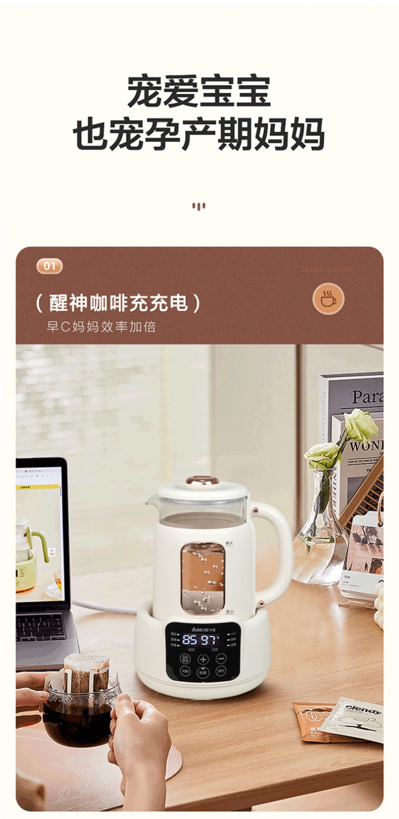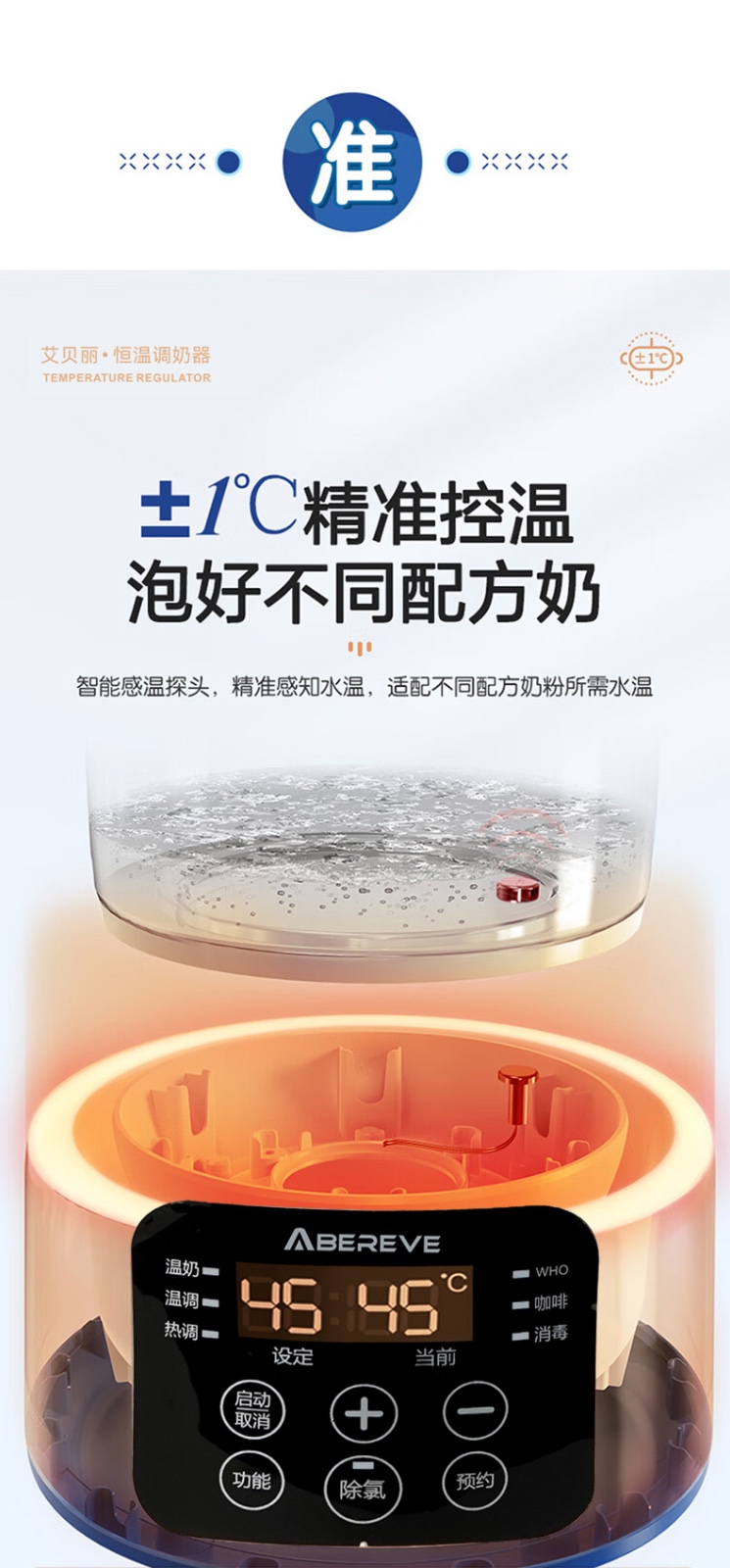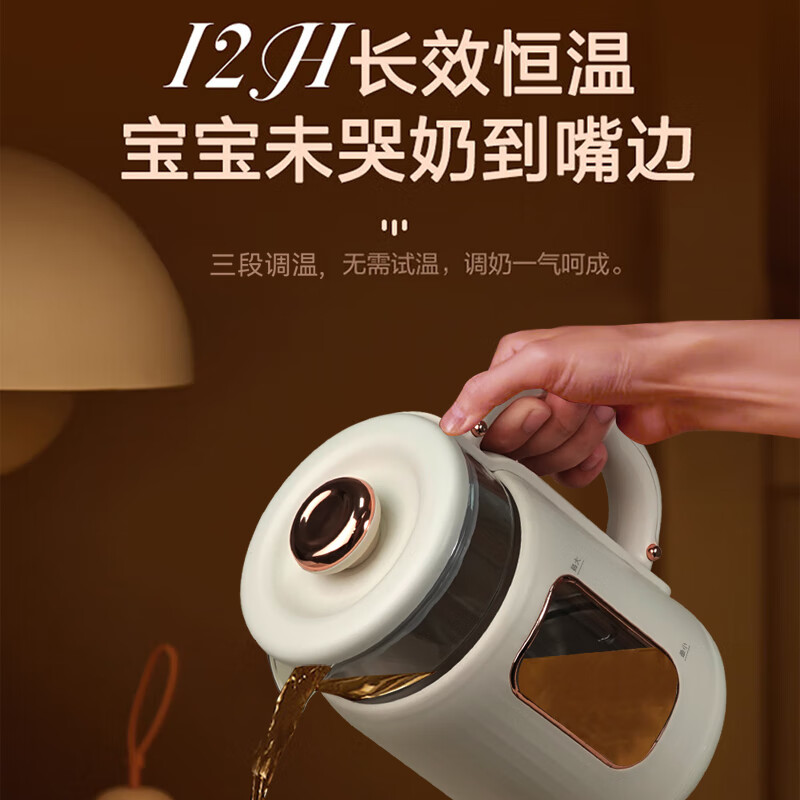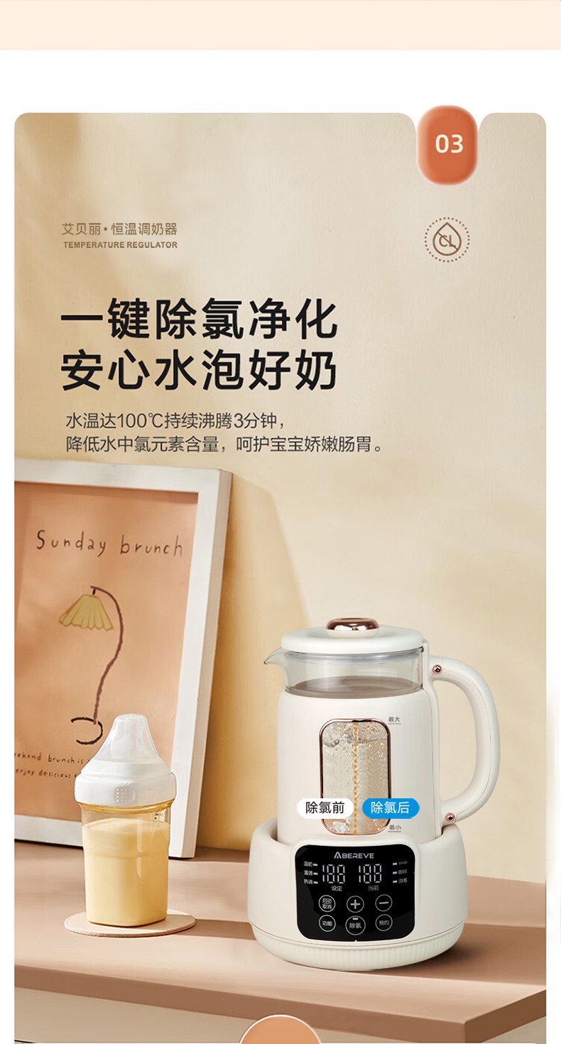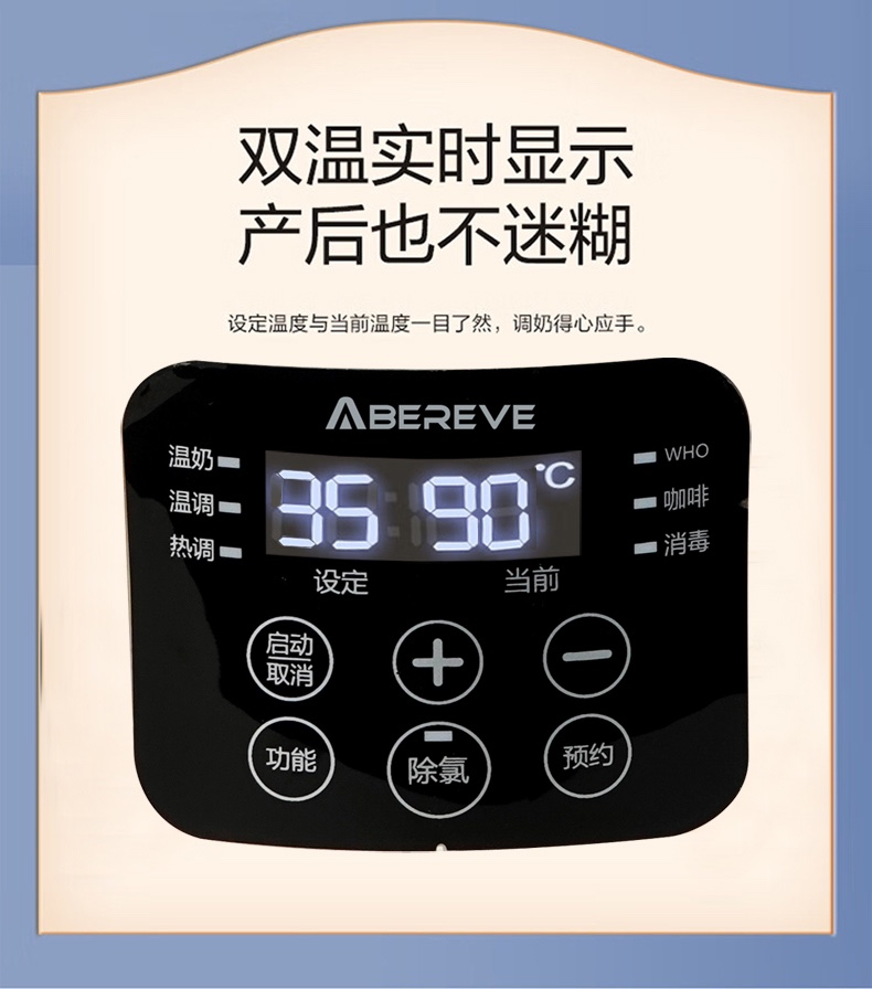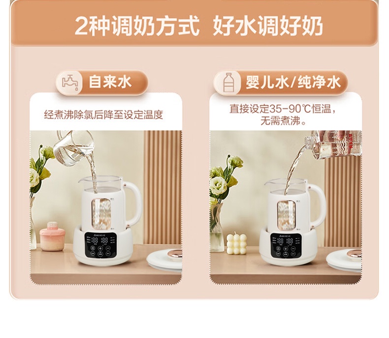 双温实时显示,设定温度和当前温度一目了然 800ml宝宝小水库,一次煮水可用多次 一键除氯净化,安心水泡好奶