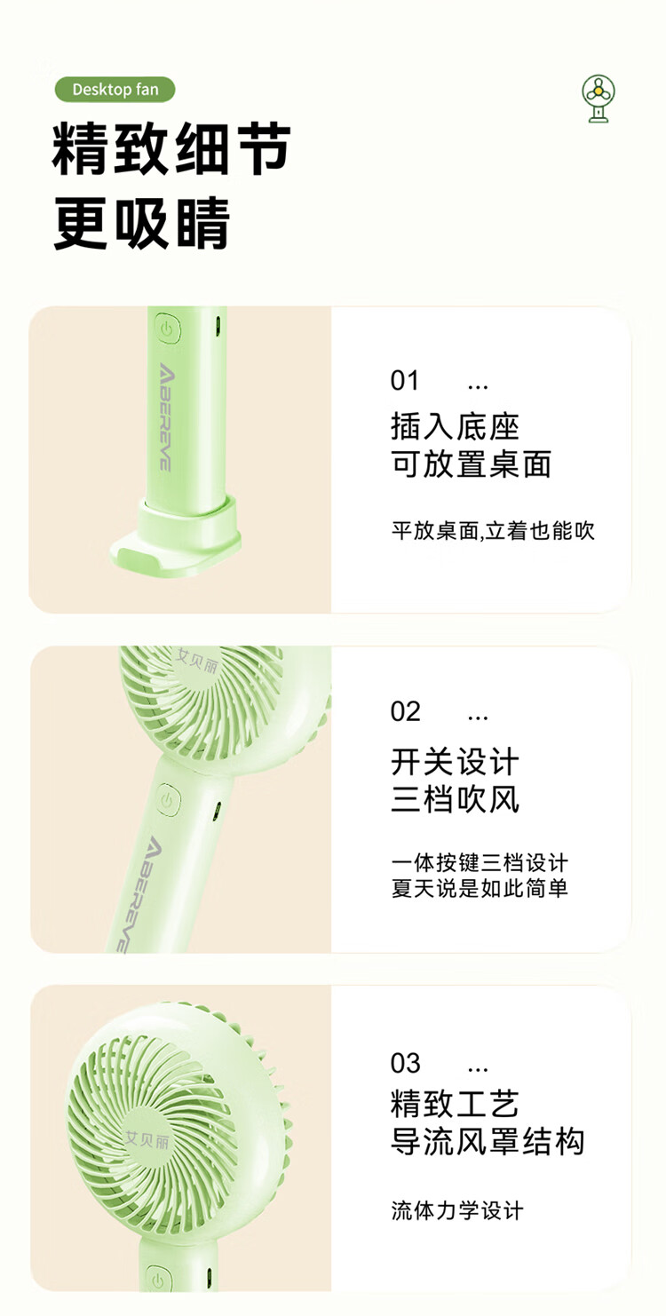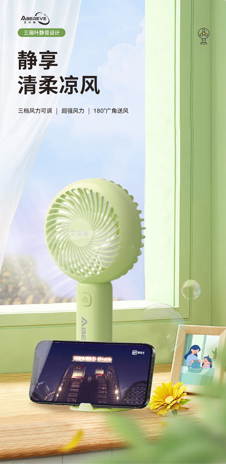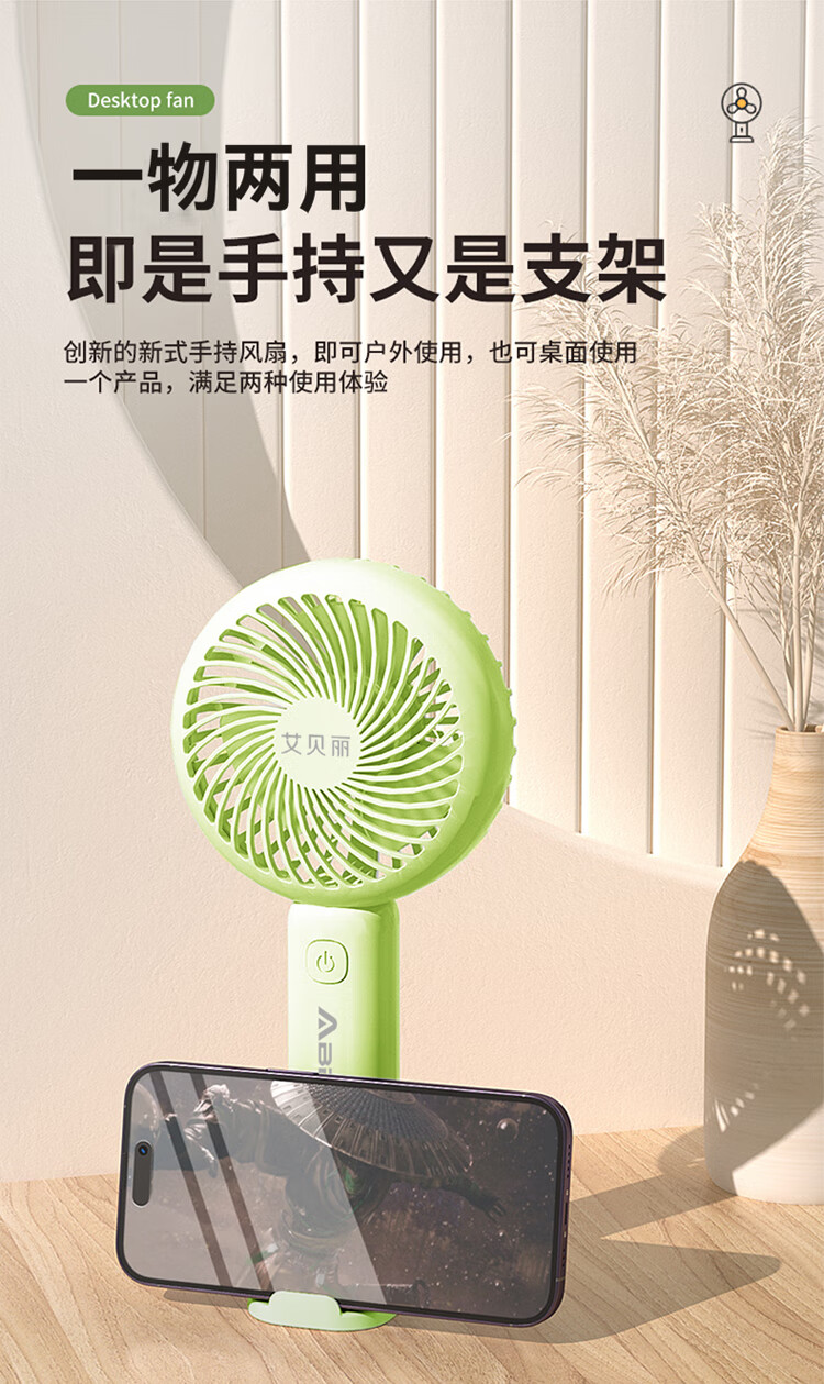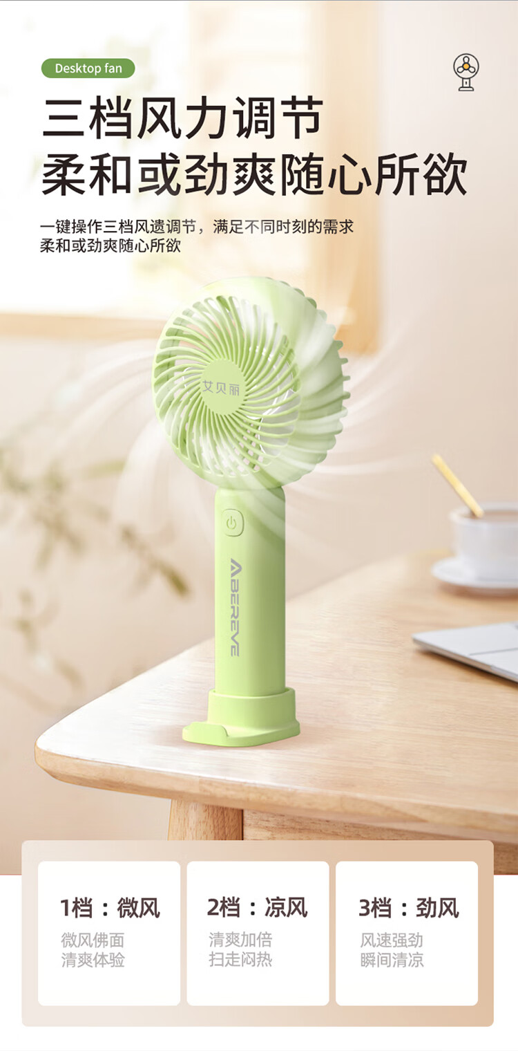 \\\\\\\"三档风力可调,180°广角送风 可手持式,可置桌面,轻巧便携 一物两用,既是风扇,也是支架 小身材超长续航,清凉不断档