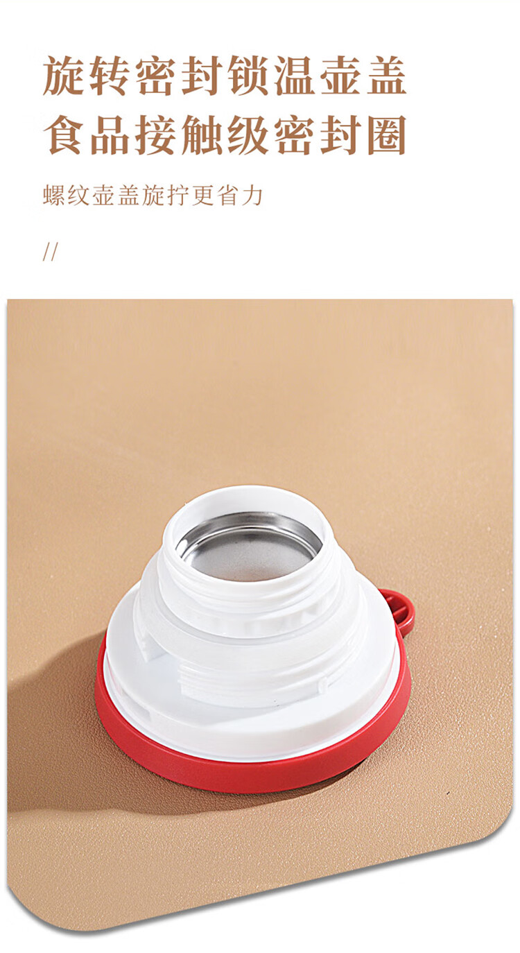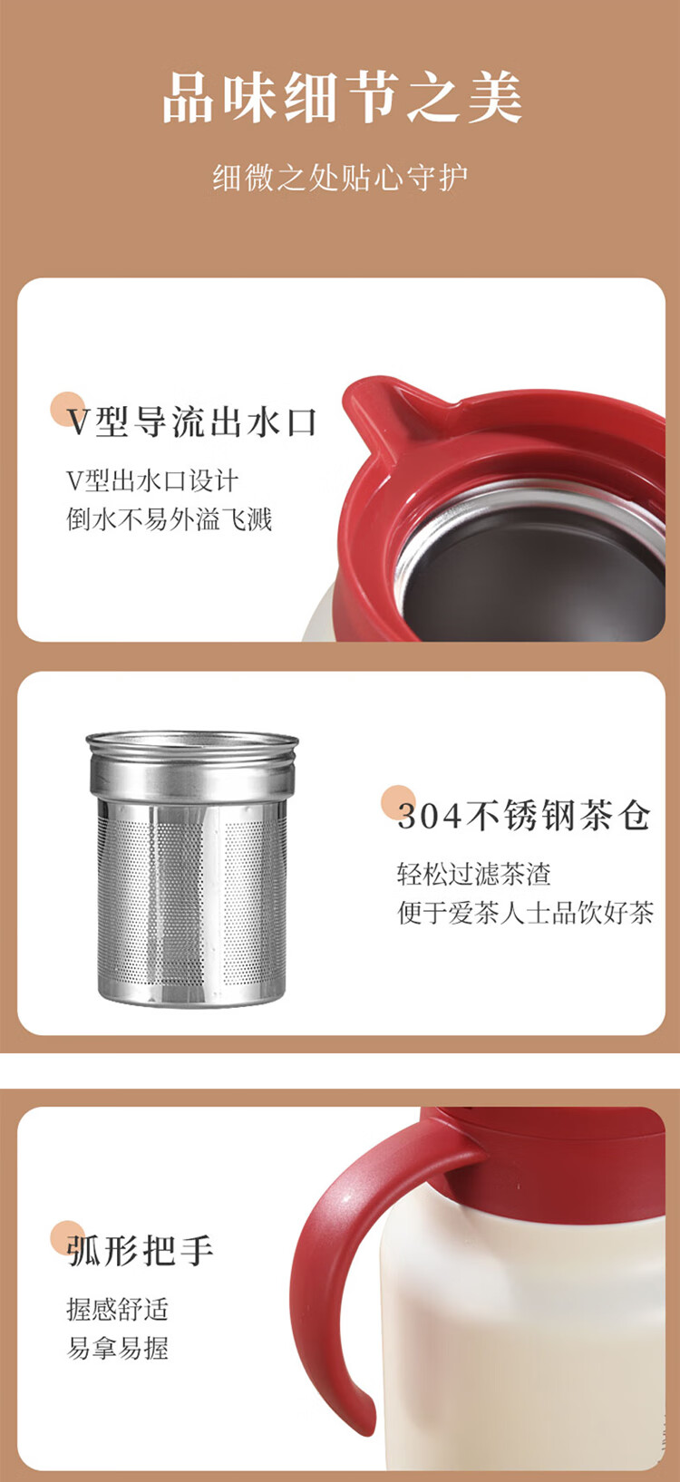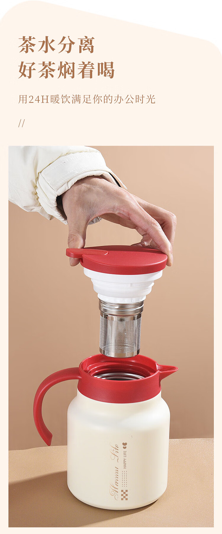 \"焖烧壶304不锈钢内胆,食品级硅胶材质,喝水更健康。 一键按压出水,单手可操作,省时省力。 可拆卸式茶仓,茶水分离