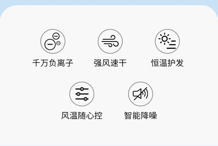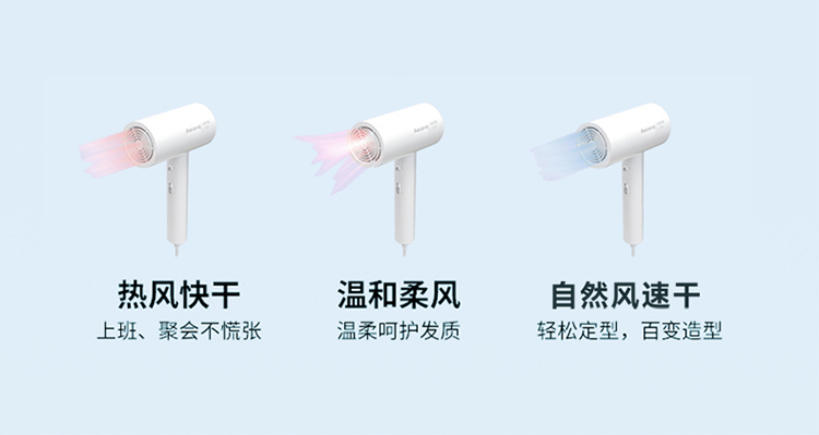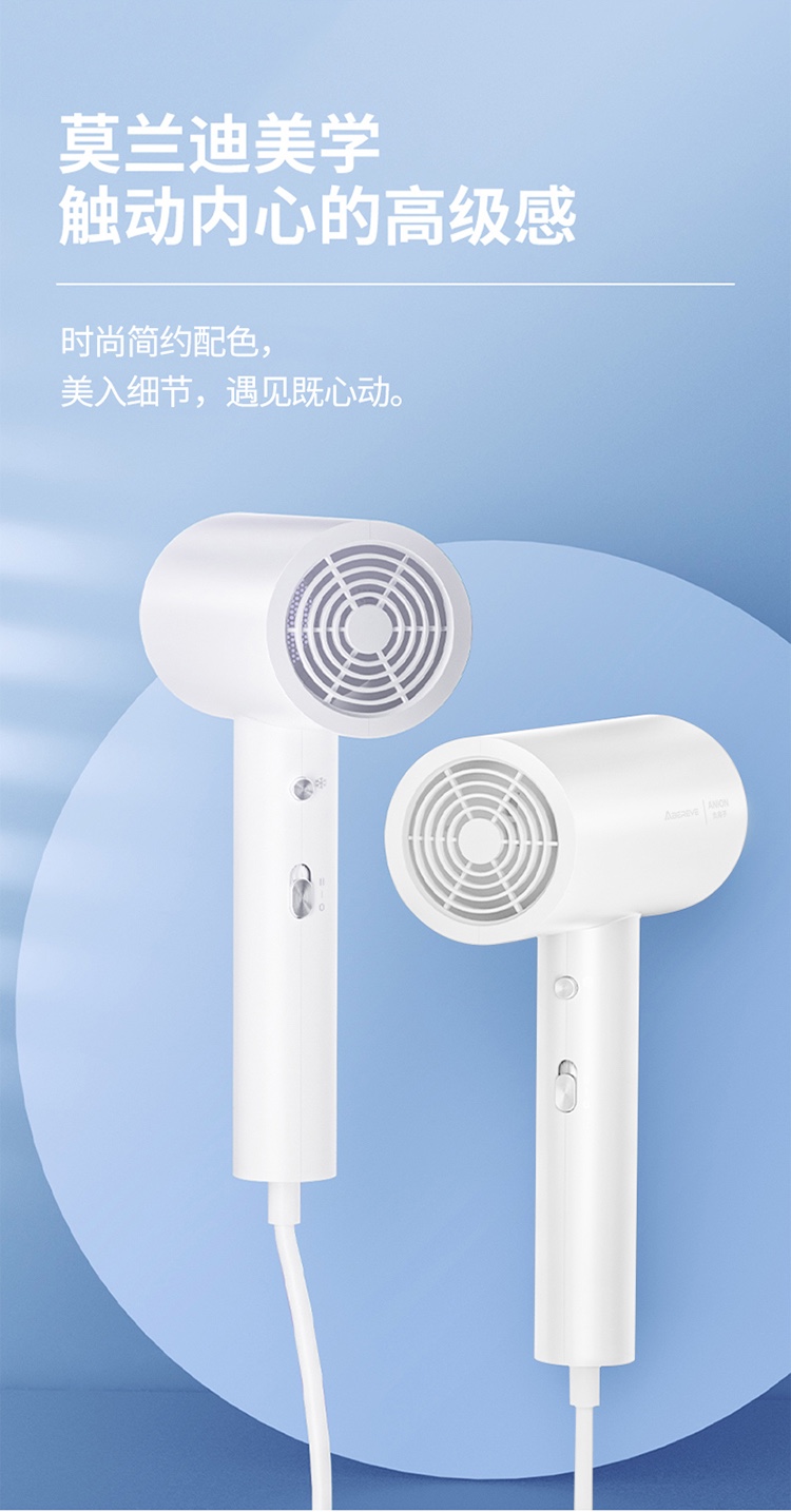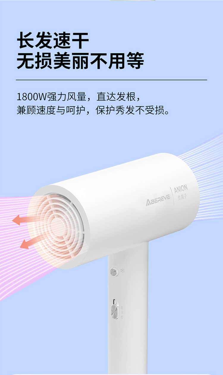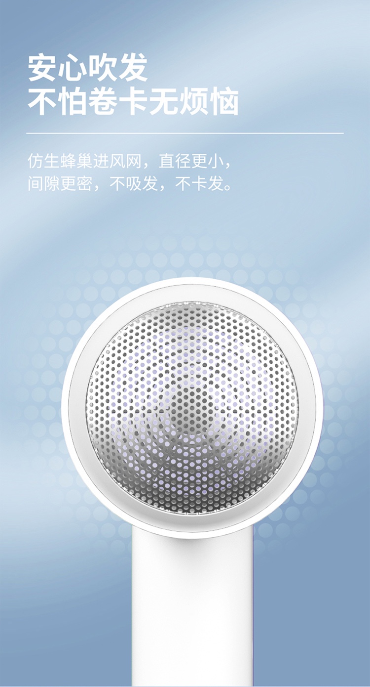 5000万级负离子护发,1800W大功率 慢暖风模式,快热风模式,冷风速干模式 降噪风叶优化 仿生蜂巢进网,不吸发卡发