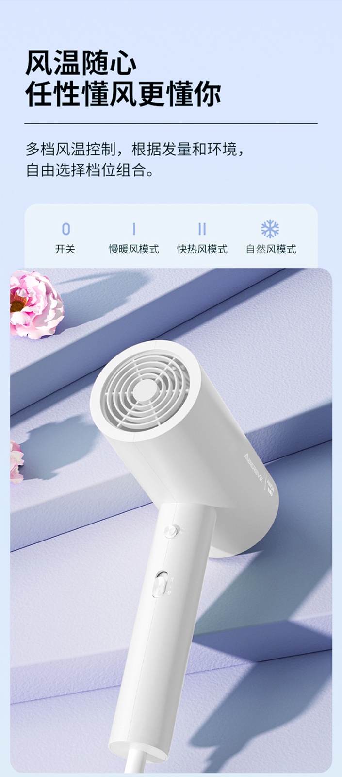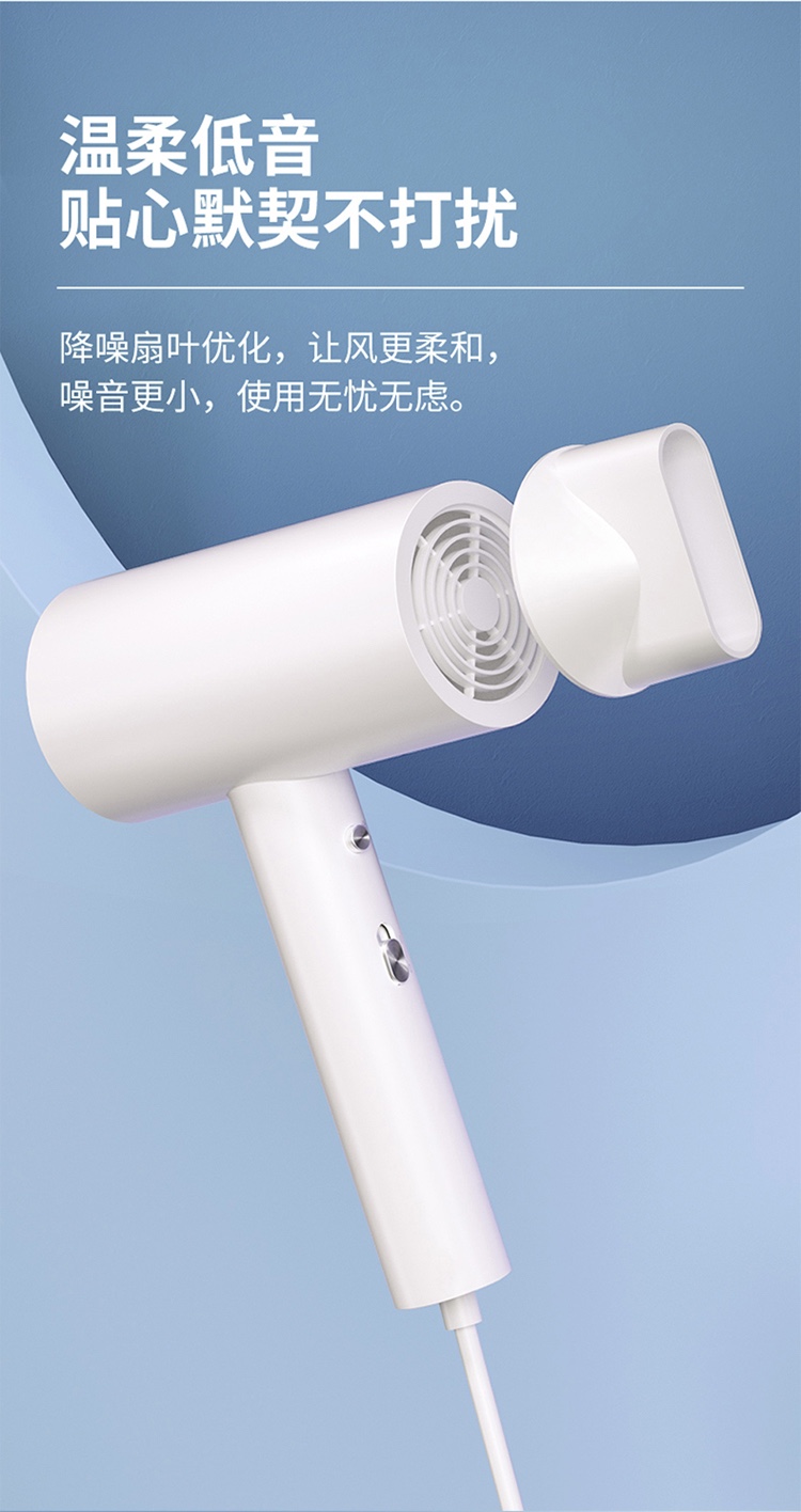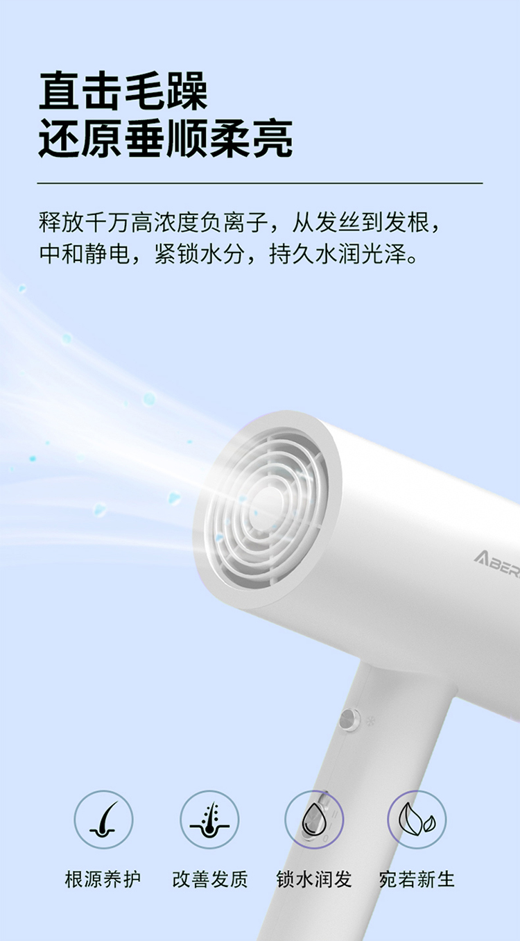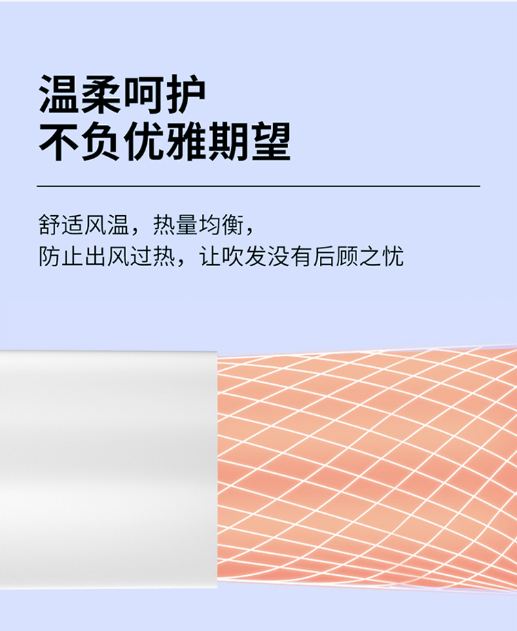5000万级负离子护发,1800W大功率 慢暖风模式,快热风模式,冷风速干模式 降噪风叶优化 仿生蜂巢进网,不吸发卡发