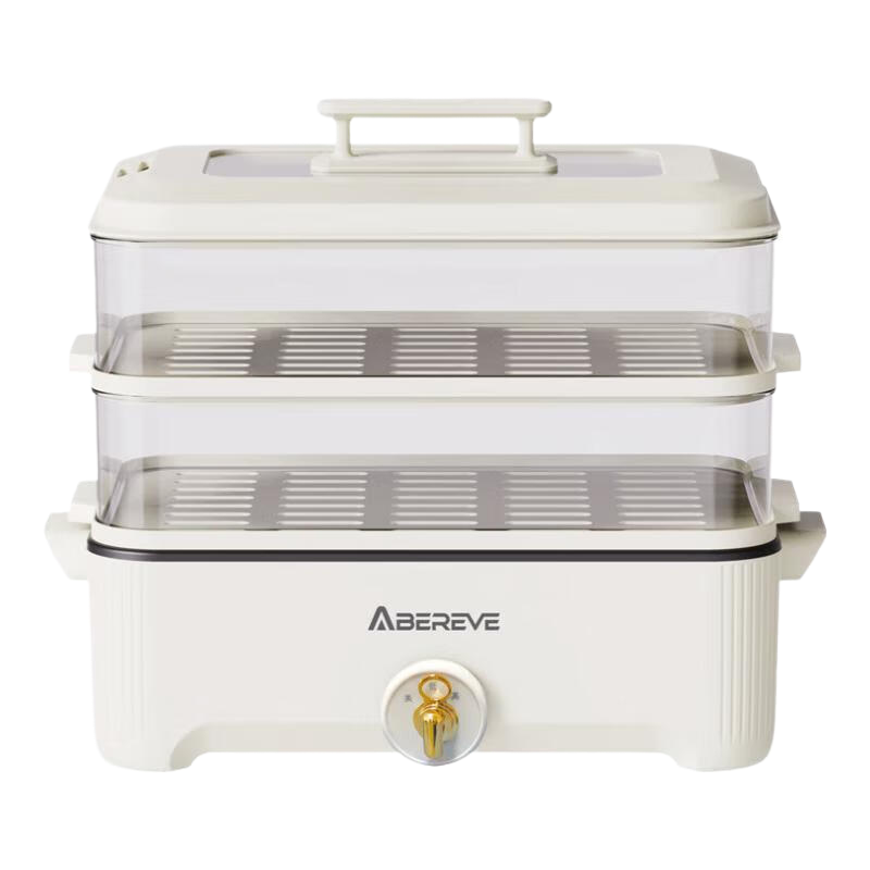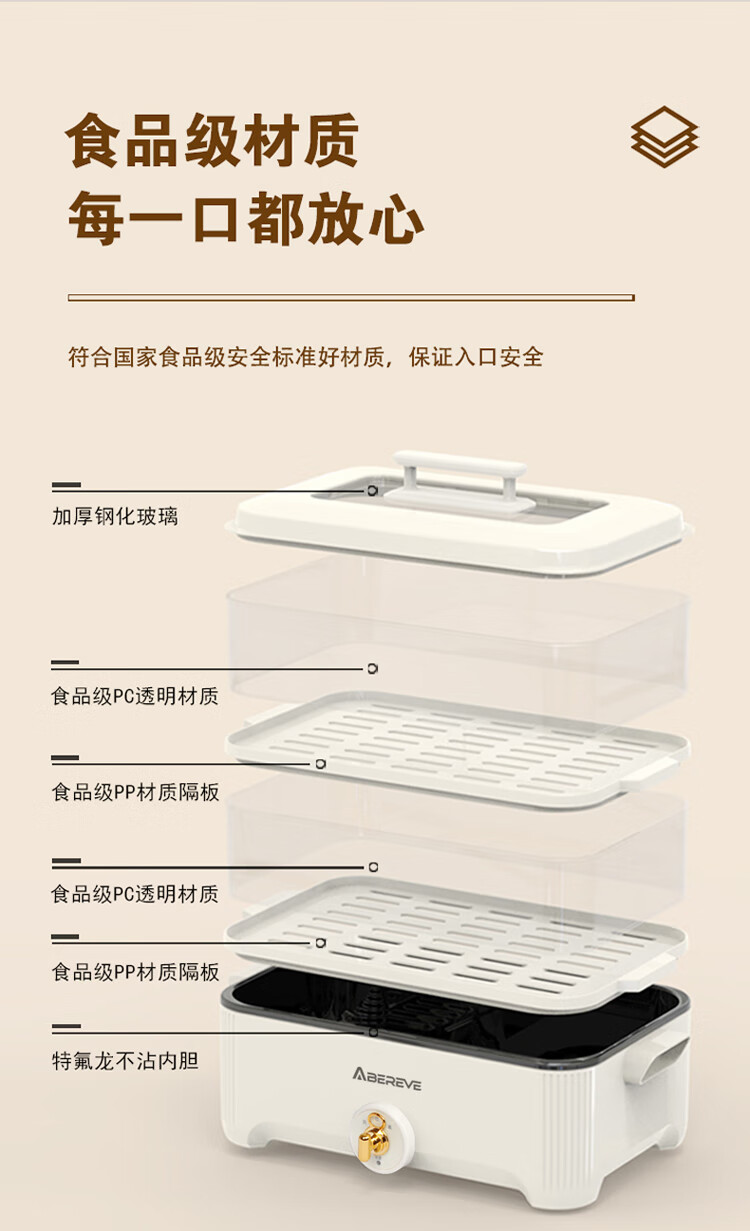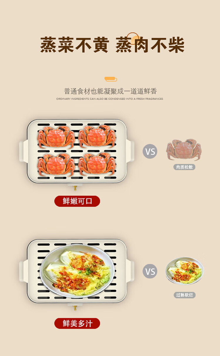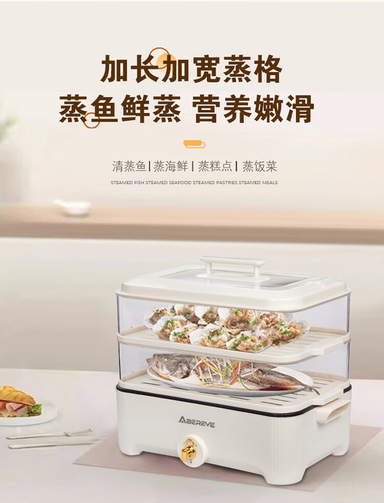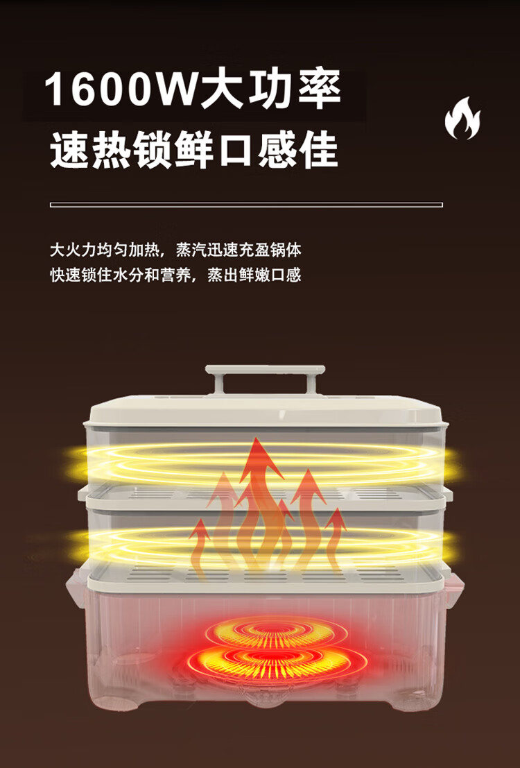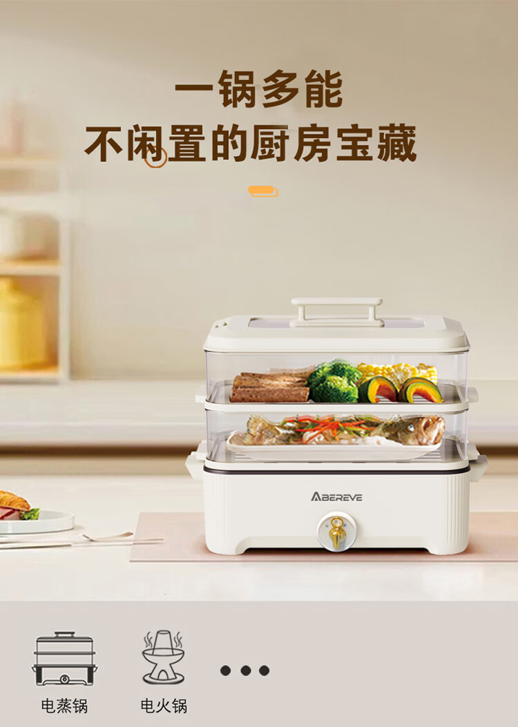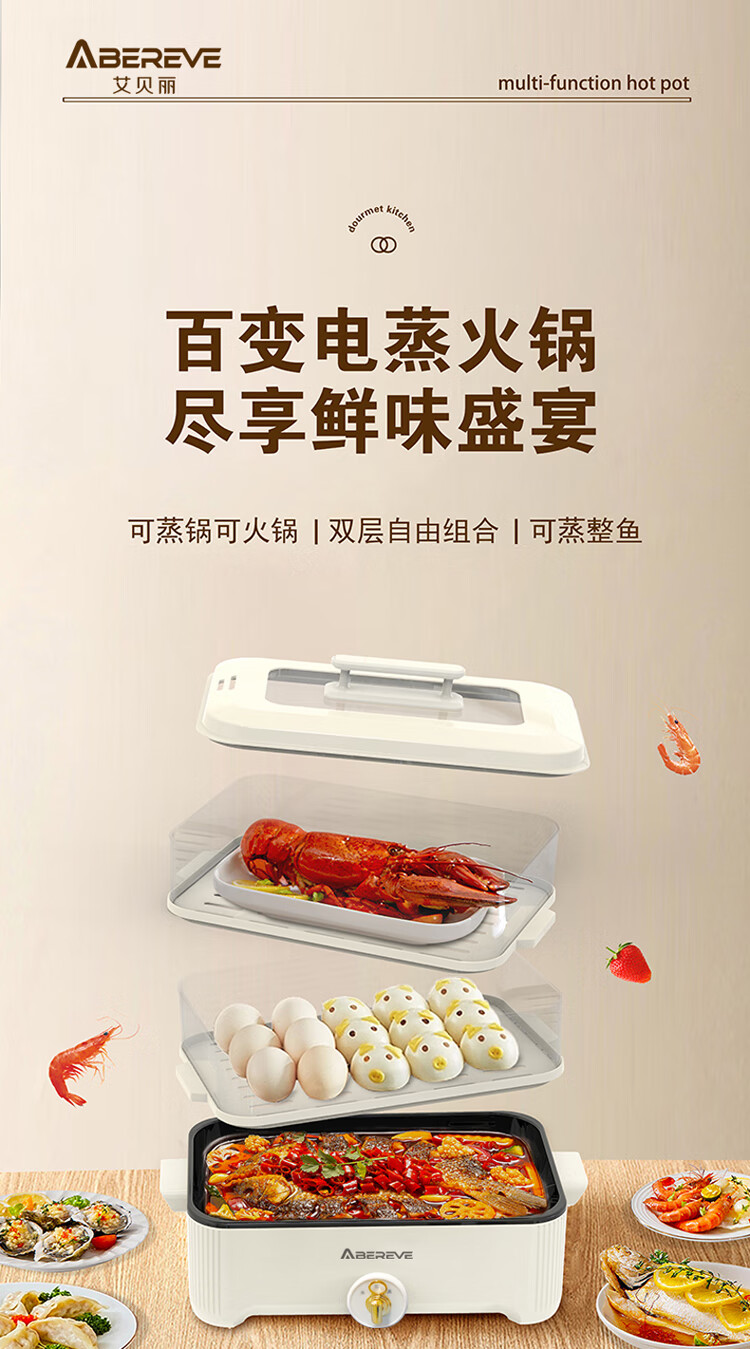 \"百变电蒸火锅 尽享鲜味盛宴 可蒸可火锅 双层自由组合 可蒸整鱼 5升大容量 食品级材质 旋钮操作