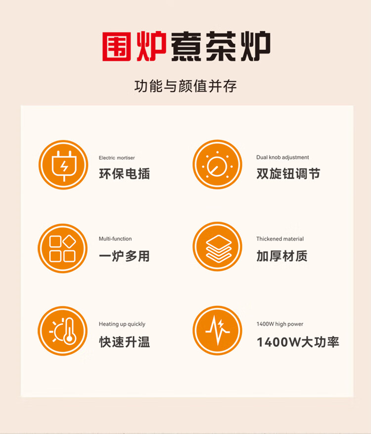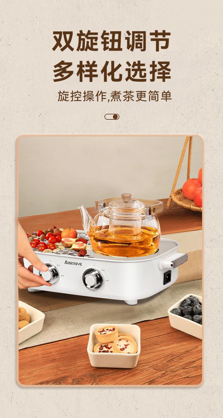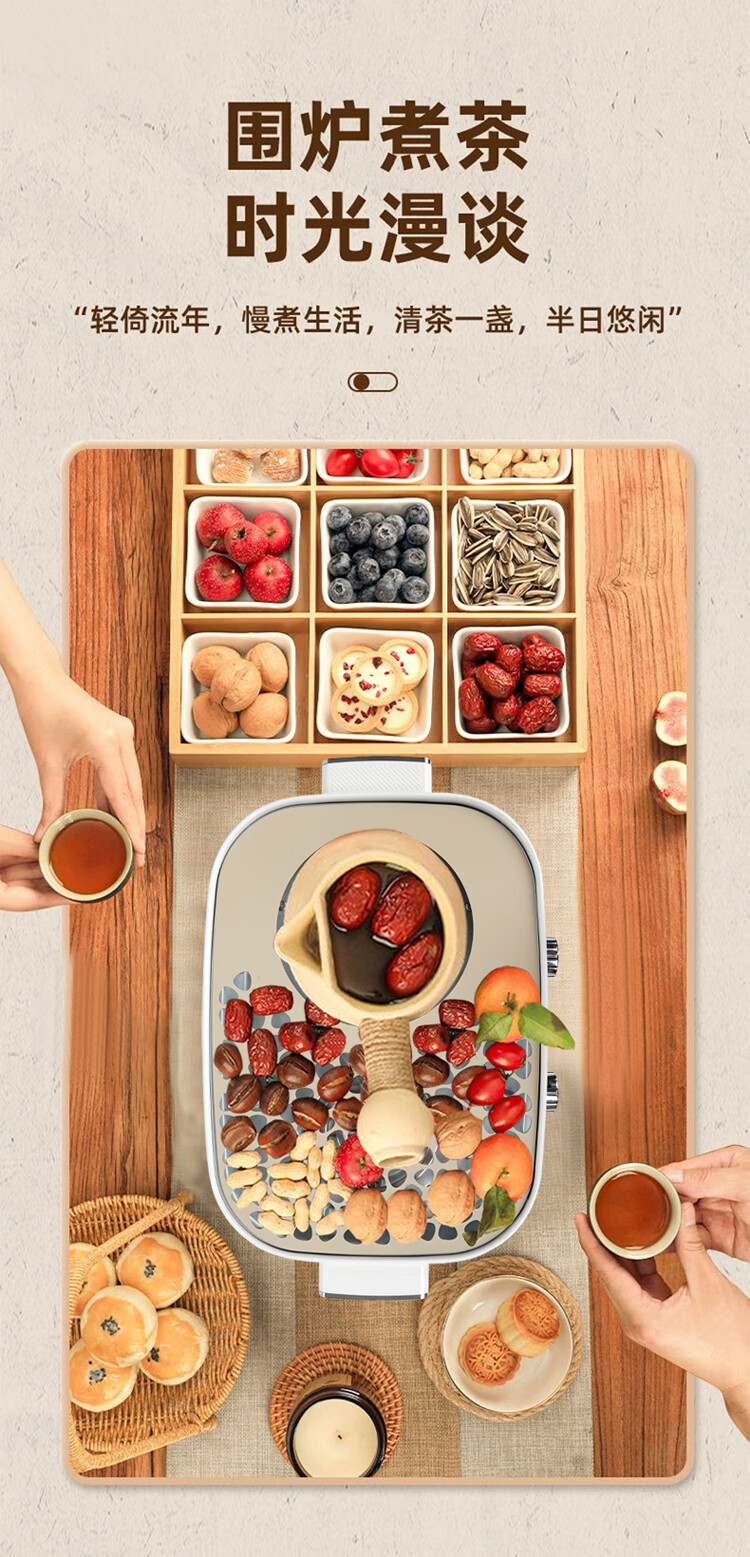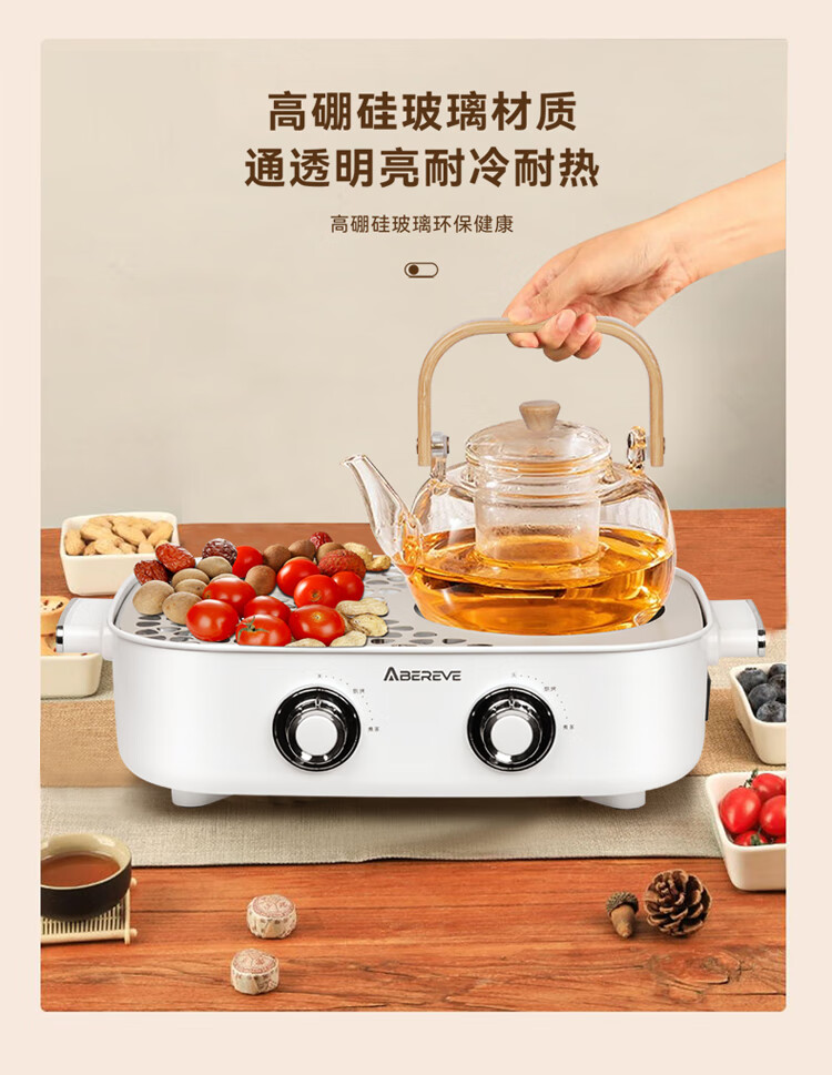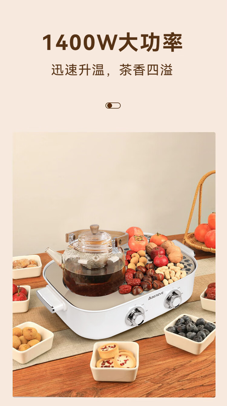 煮茶/烘烤/干果/取暖 高硼硅玻璃材质 通透明亮 耐热耐冷 双旋钮调节 多样化选择 煮茶更简单 1400W大功率