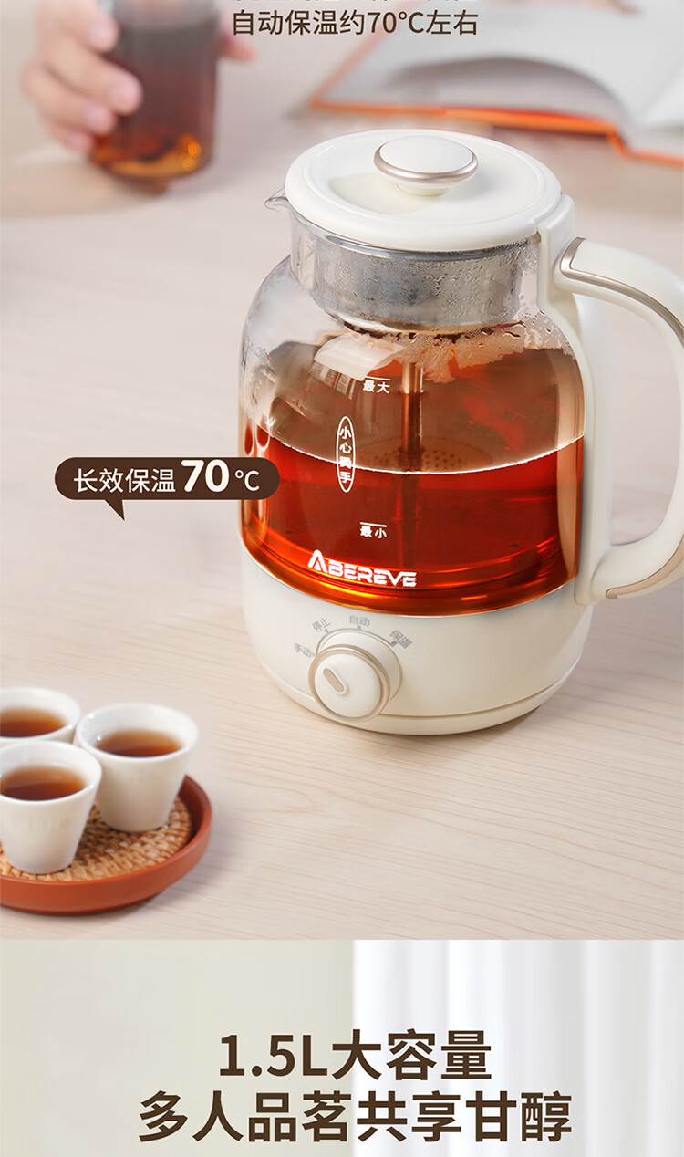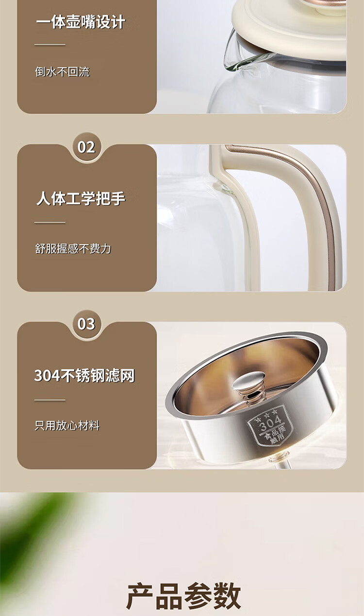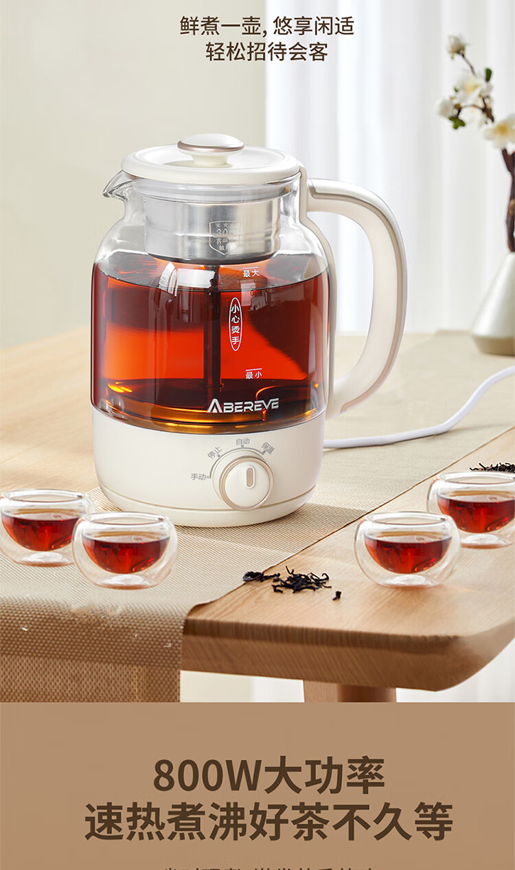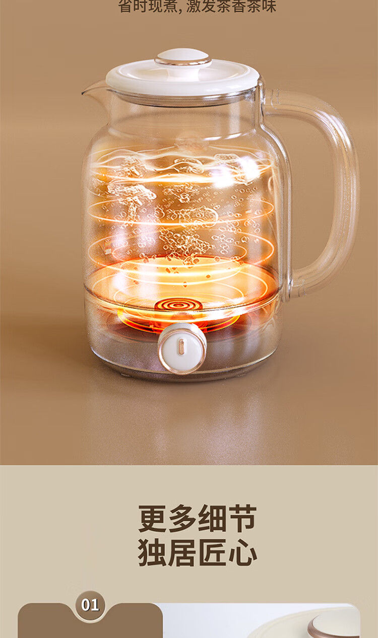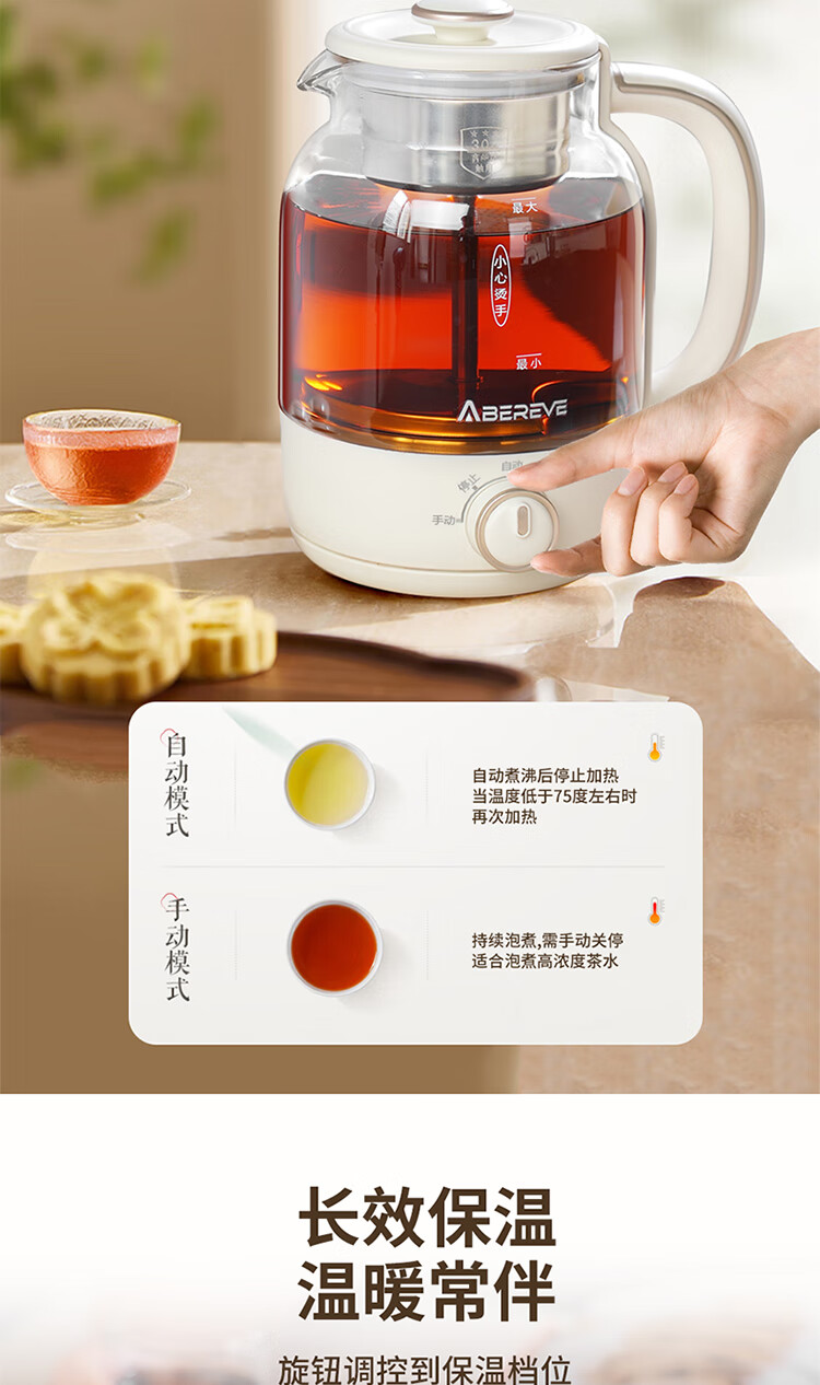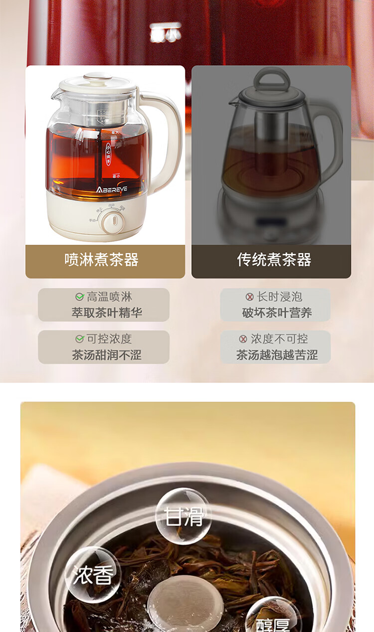 \"喷淋式煮茶 深度萃取 享品茶韵 旋钮操作,三大功能(手动/自动/保温) 360°无死角喷淋 均匀式喷洒 长效保温70°