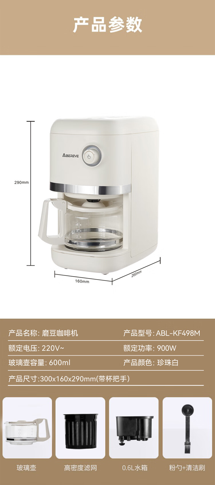 商品名称:艾贝丽全自动美式磨豆咖啡机 1.5L ABL-KF498M 6972149934413 偏远另加运费