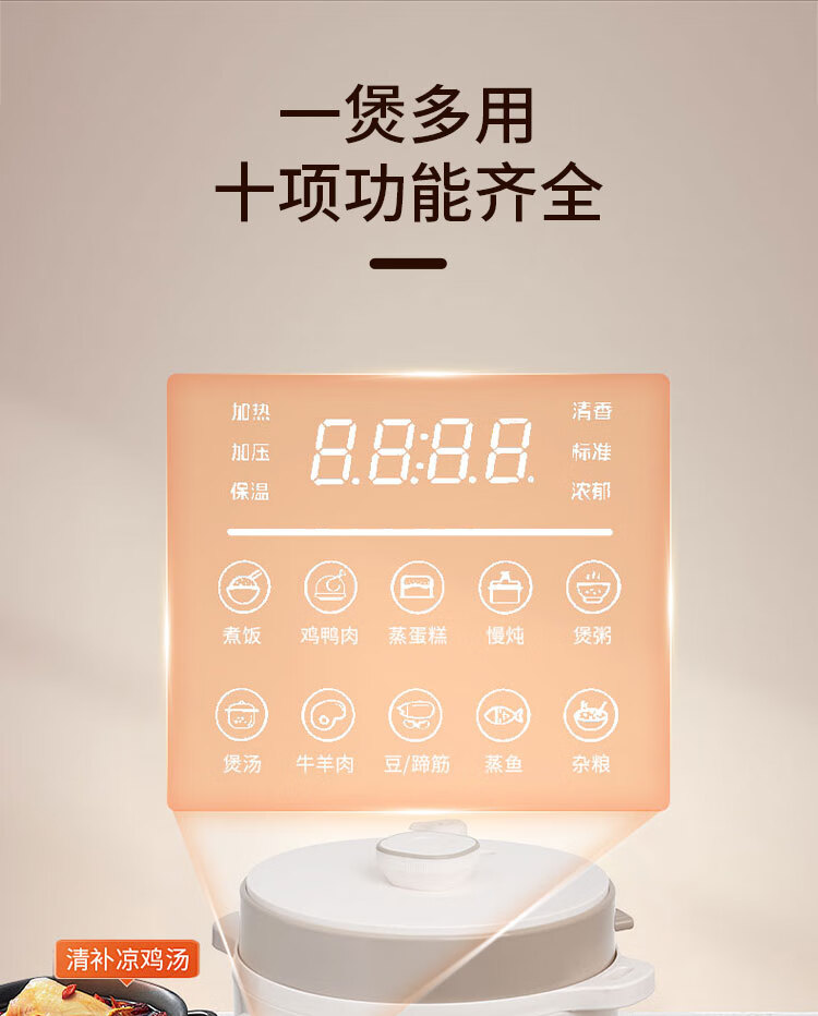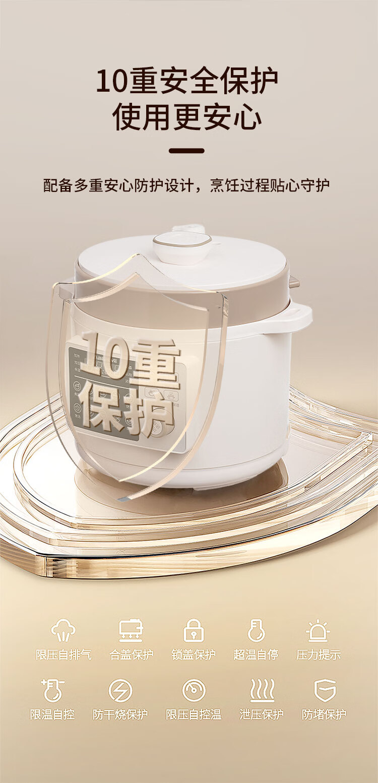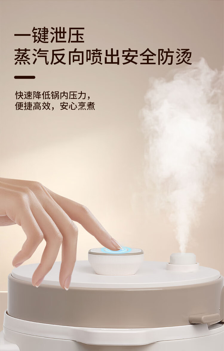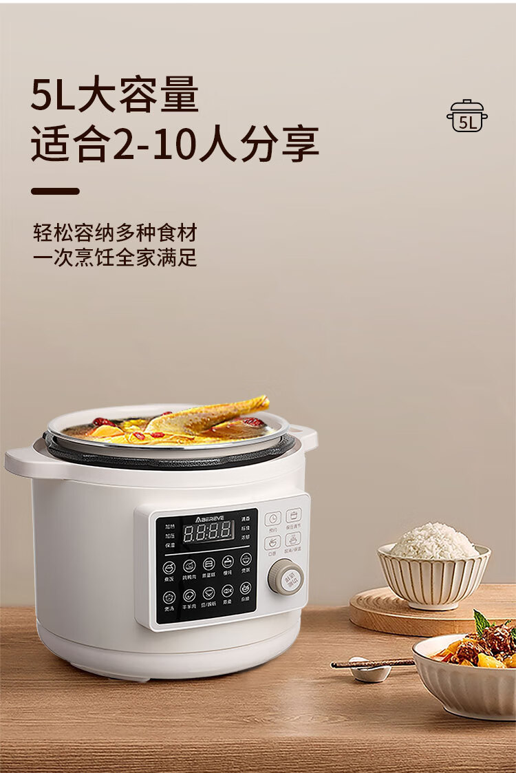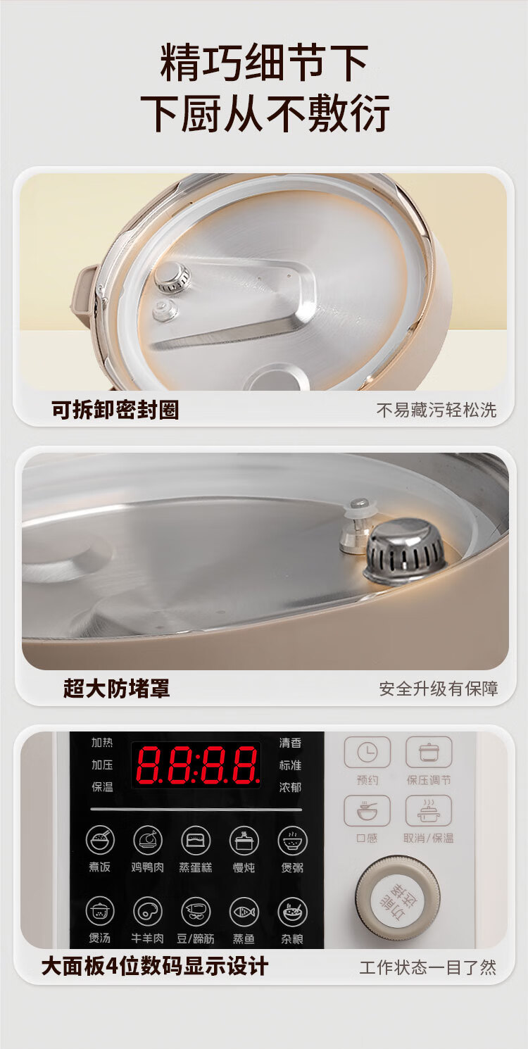 \"5L家庭容量高压快煮 智能10大菜单 轻松随心选 支持开盖煮 可开盖收汁 一键排气 多重防护更安全 智能预约
