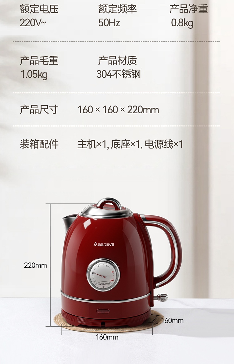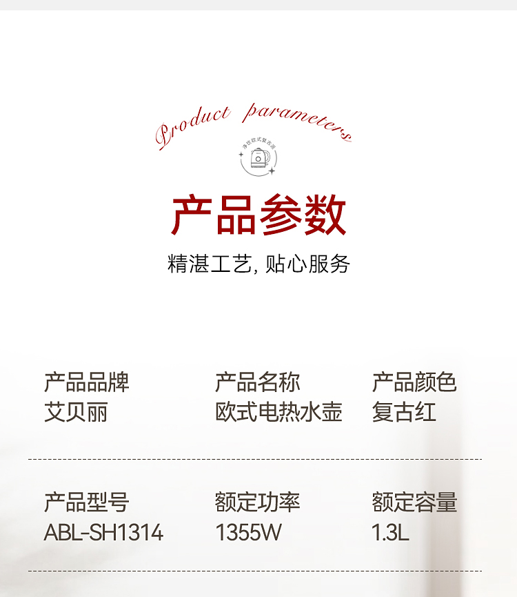商品名称:艾贝丽欧式电热水壶 1.3L ABL-SH1314 6972149934543 偏远另加运费