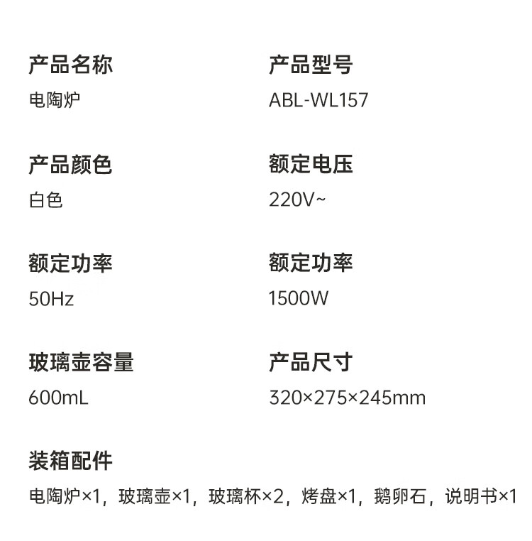 商品名称:艾贝丽围炉煮茶器 600ML ABL-WL157 6972149935090 偏远另加运费