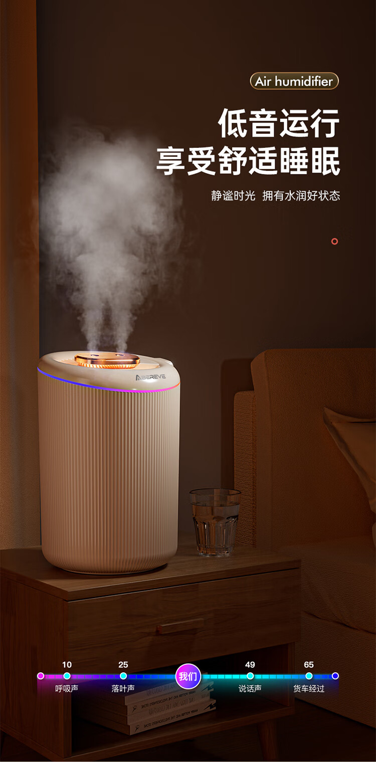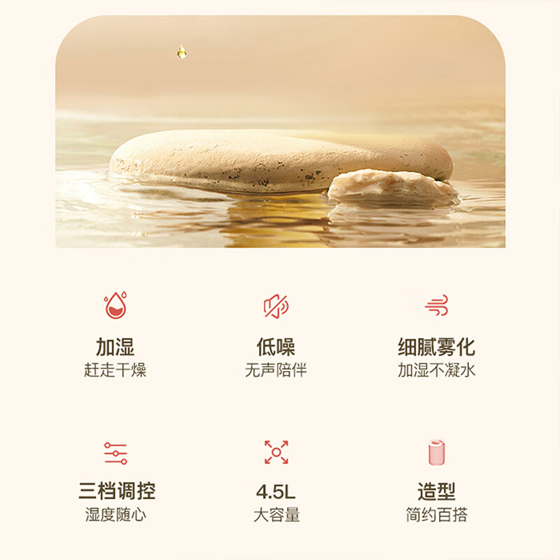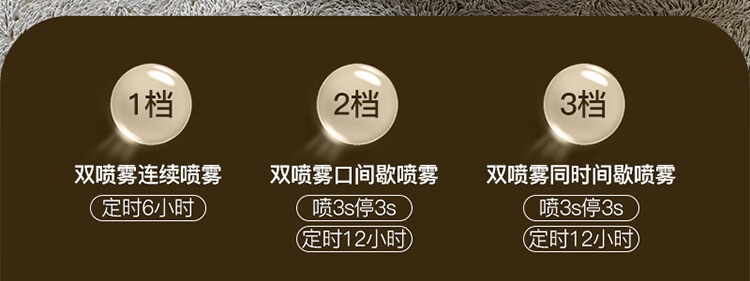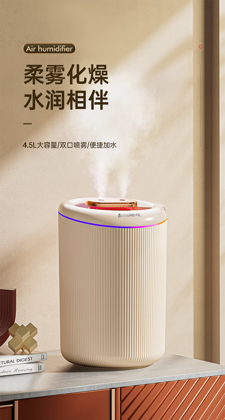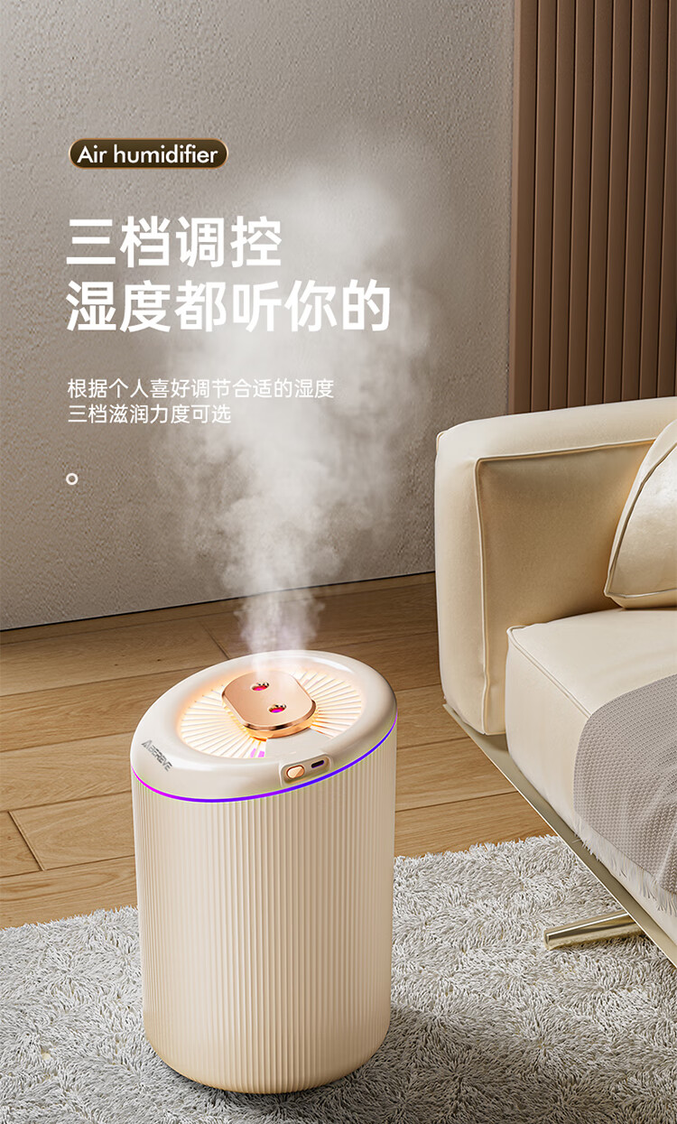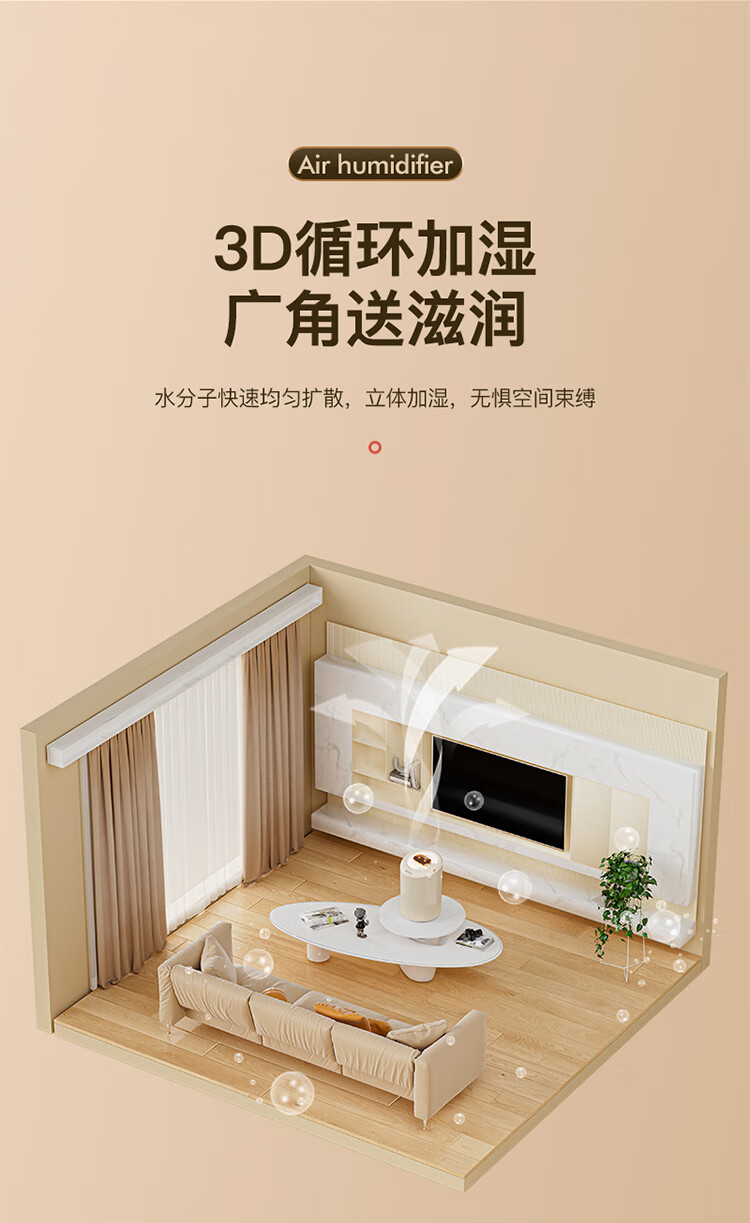 \"4.5L大容量水箱,双控喷雾,细腻雾化,加湿不凝水 智能定时开关,三档模式调节,湿度随心调节 低分贝运行,立体广角循环