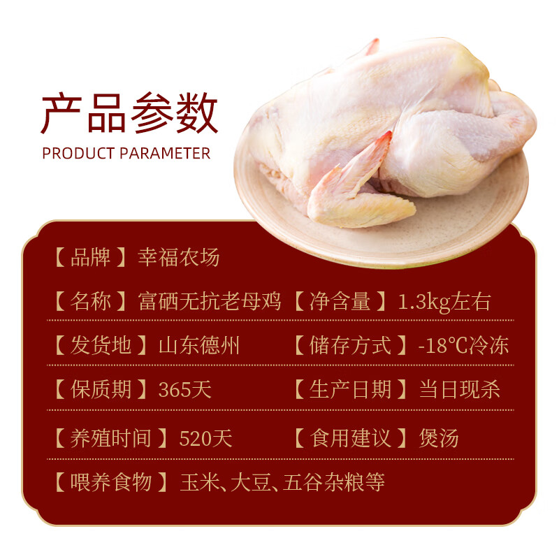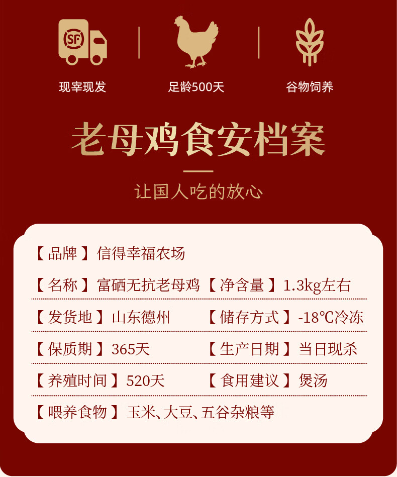 商品名称:信得幸福农场富硒老母鸡礼盒约1.4kg